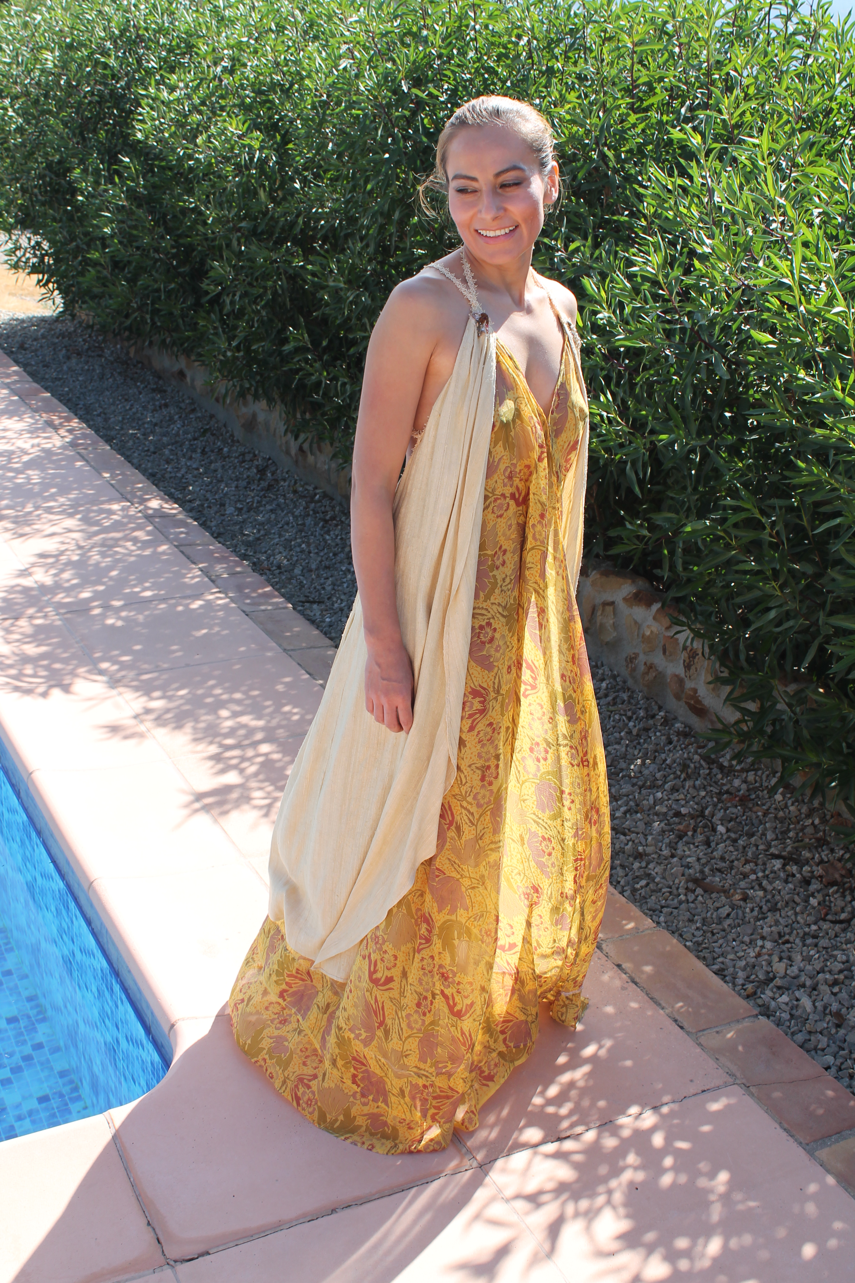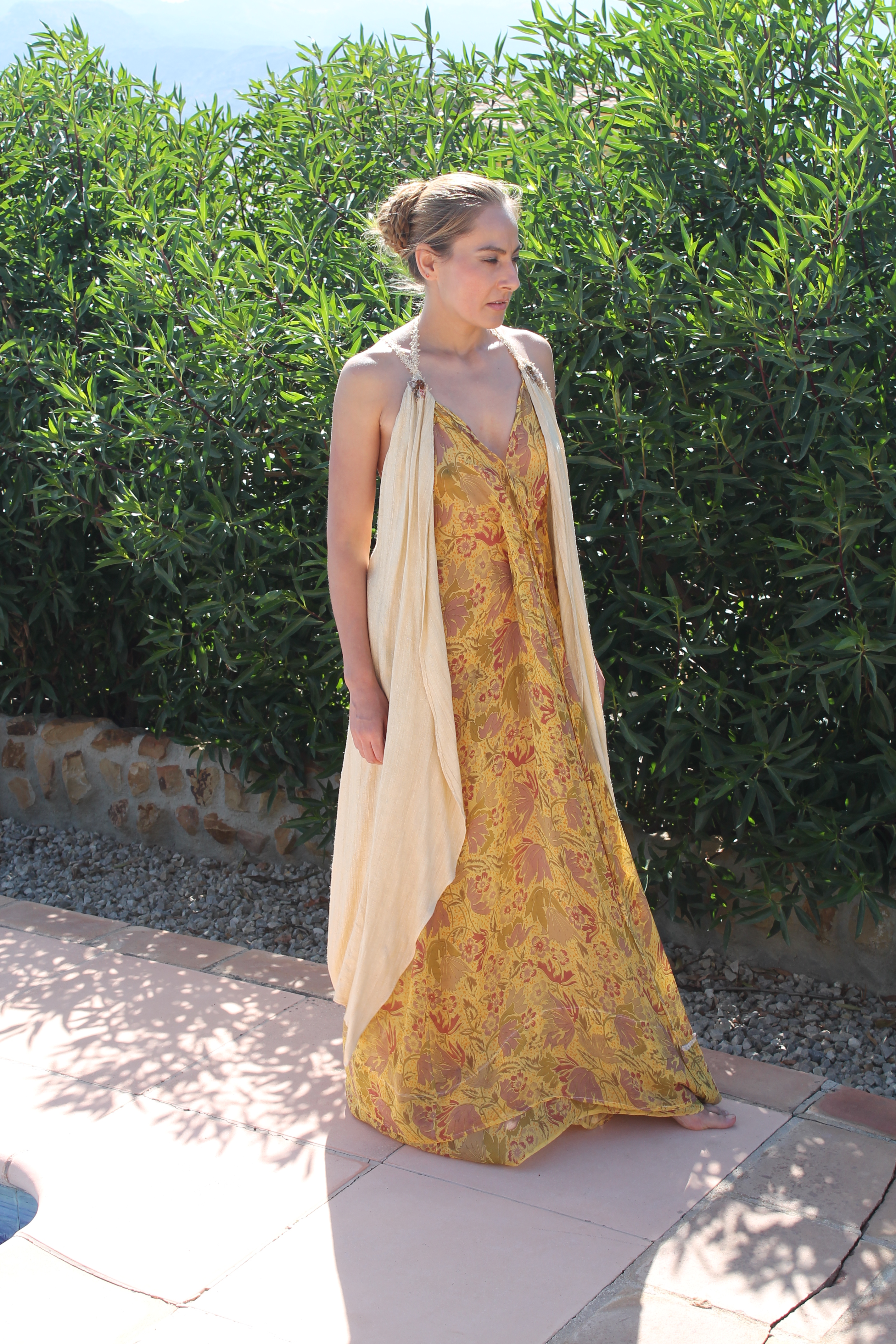 Traje realizado en seda natural y gasa de seda estampada.