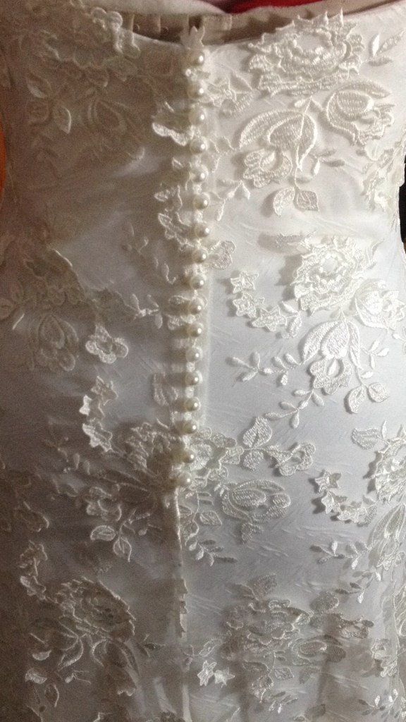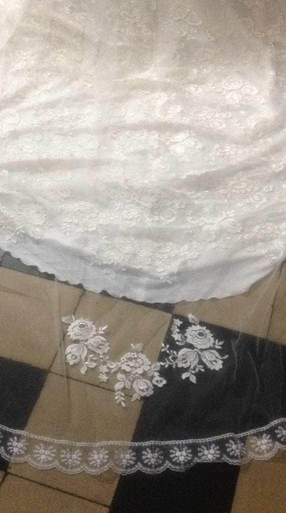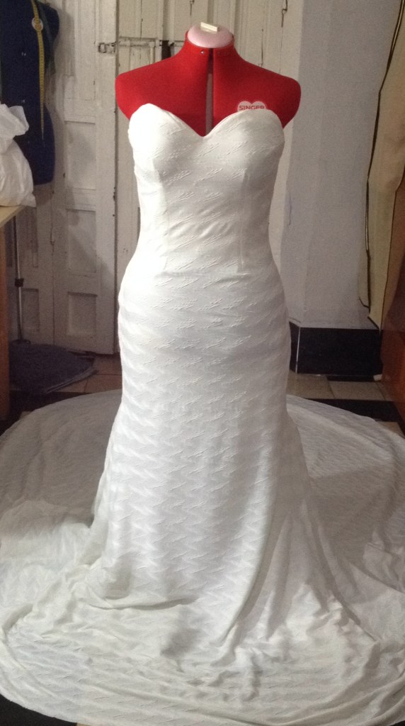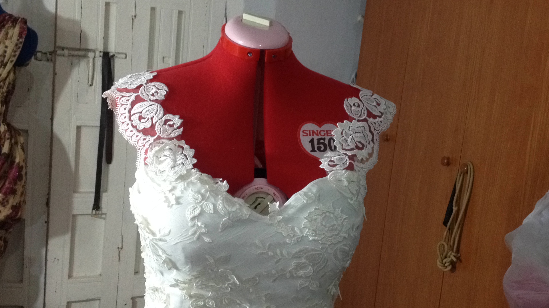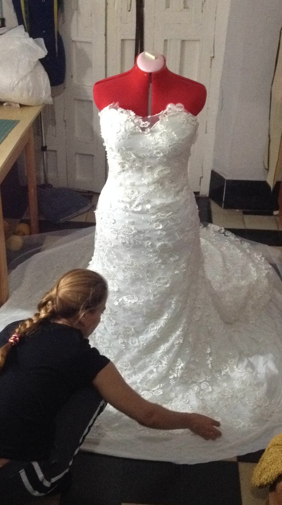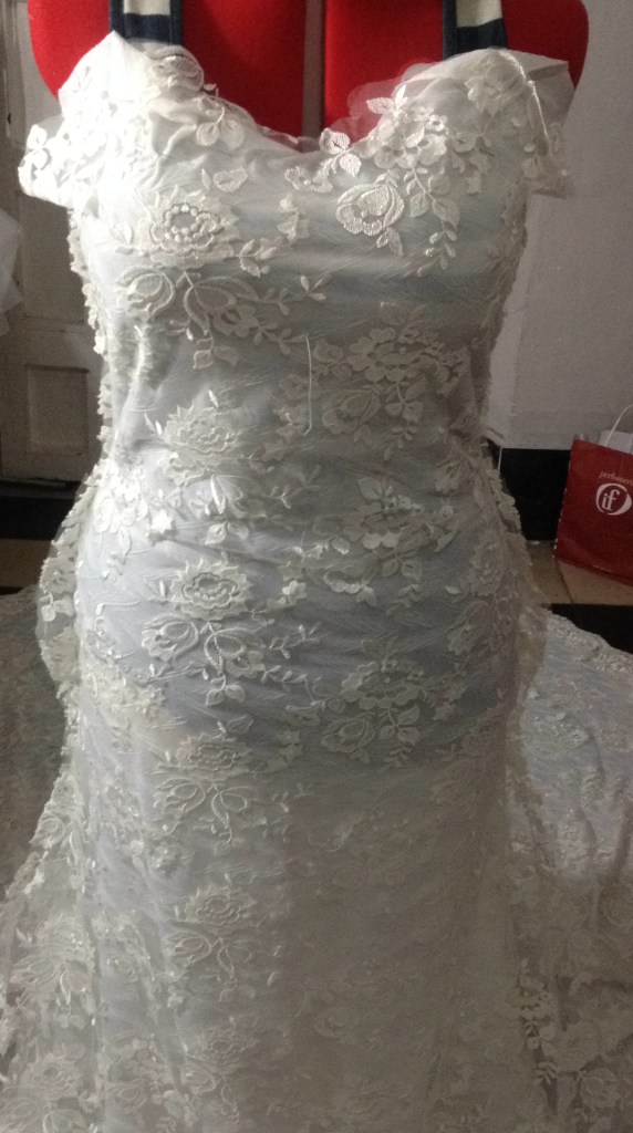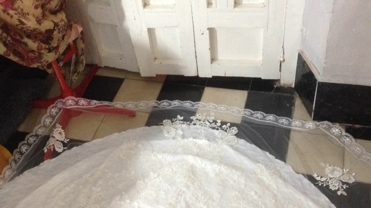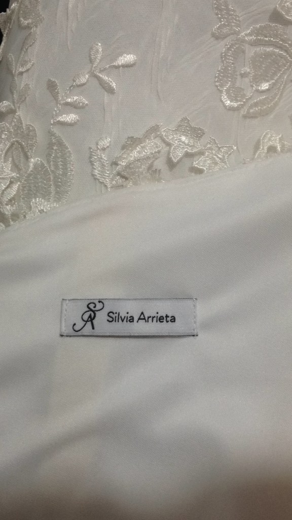Una novia muy especial. A very special bride. Elaborado con encaje de shantung de seda y bámbula de seda. Con tirantes desmontables que convierten el vestido en palabra de honor. Espalda baja con botonadura de concha nácar. Velo en tul de seda tamaño catedral y peineta de cristal de Swarovsky. Ligueros de encaje de seda con perlas bordadas. Made of silk shantung lace and silk bambula. With detachable straps that turn the dress into a strapless dress. Low back with mother-of-pearl shell buttoning. Cathedral size silk tulle veil and Swarovsky cristal comb. Lightweight silk lace with embroidered pearls.