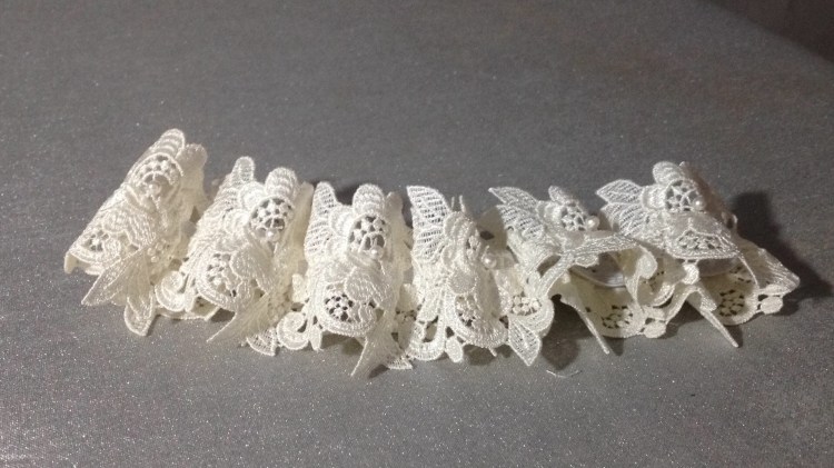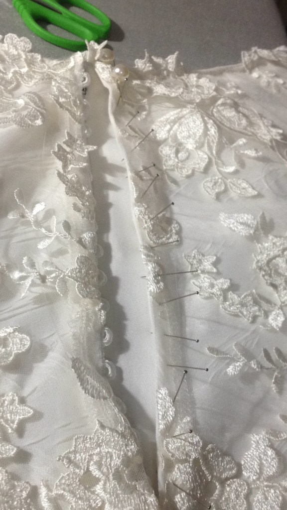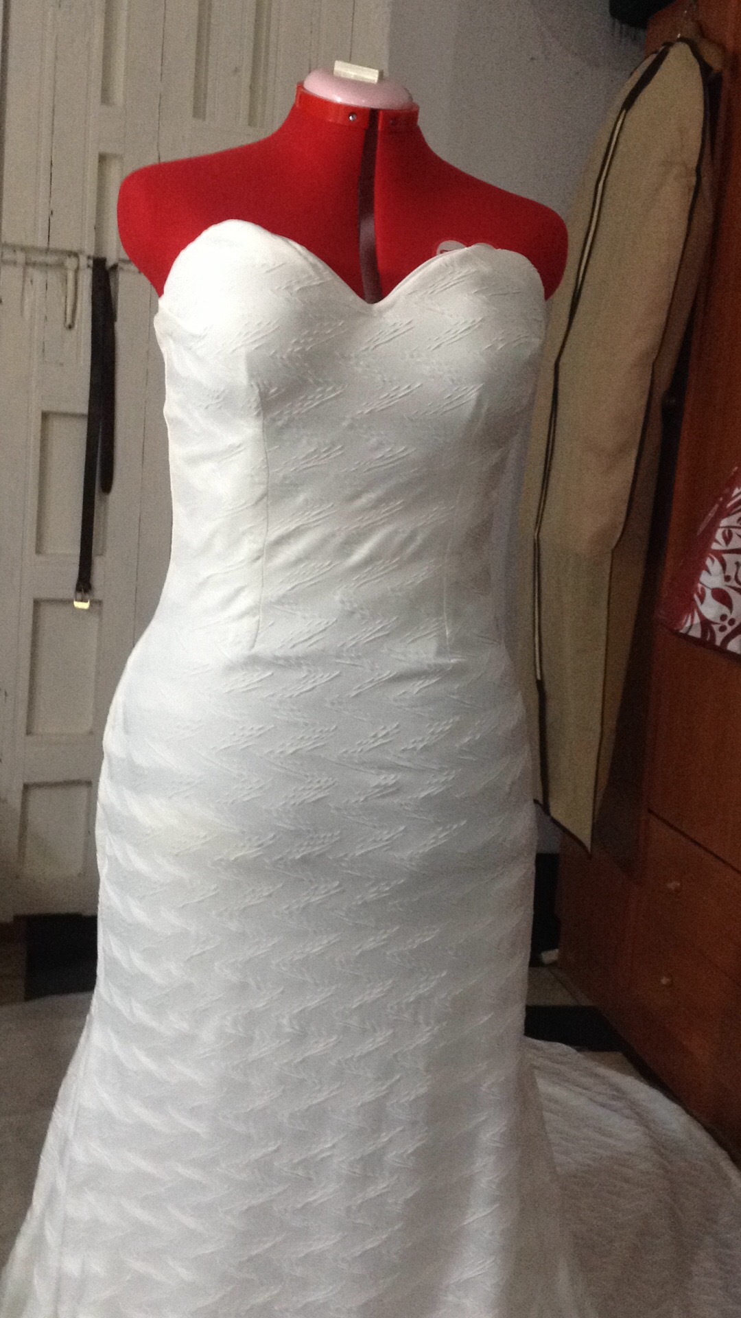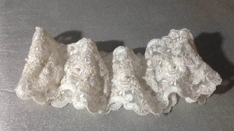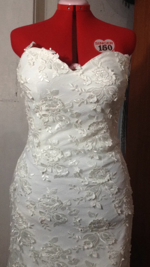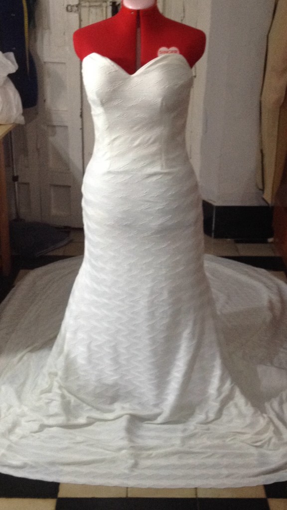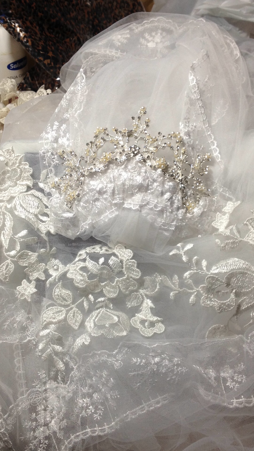 Una novia muy especial. A very special bride. Elaborado con encaje de shantung de seda y bámbula de seda. Con tirantes desmontables que convierten el vestido en palabra de honor. Espalda baja con botonadura de concha nácar. Velo en tul de seda tamaño catedral y peineta de cristal de Swarovsky. Ligueros de encaje de seda con perlas bordadas. Made of silk shantung lace and silk bambula. With detachable straps that turn the dress into a strapless dress. Low back with mother-of-pearl shell buttoning. Cathedral size silk tulle veil and Swarovsky cristal comb. Lightweight silk lace with embroidered pearls.