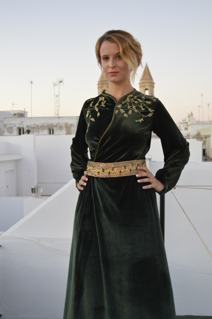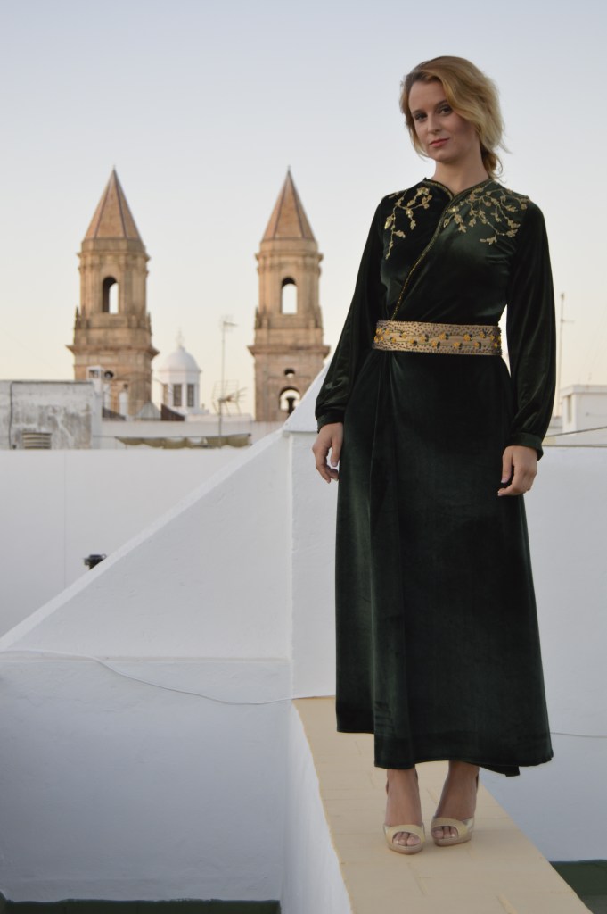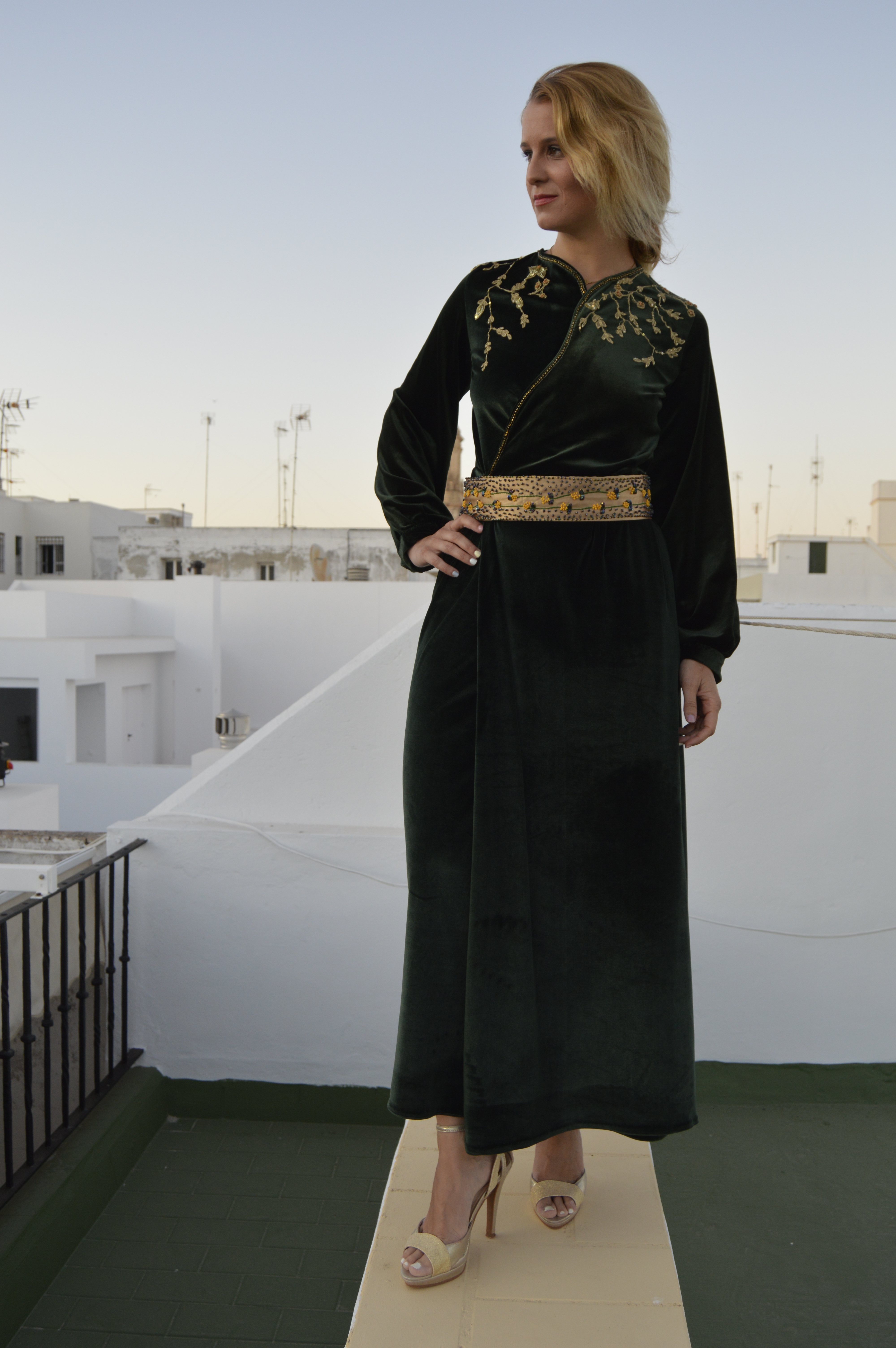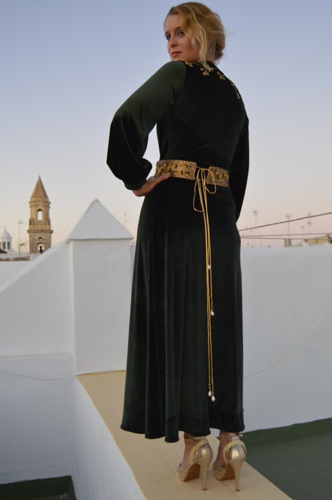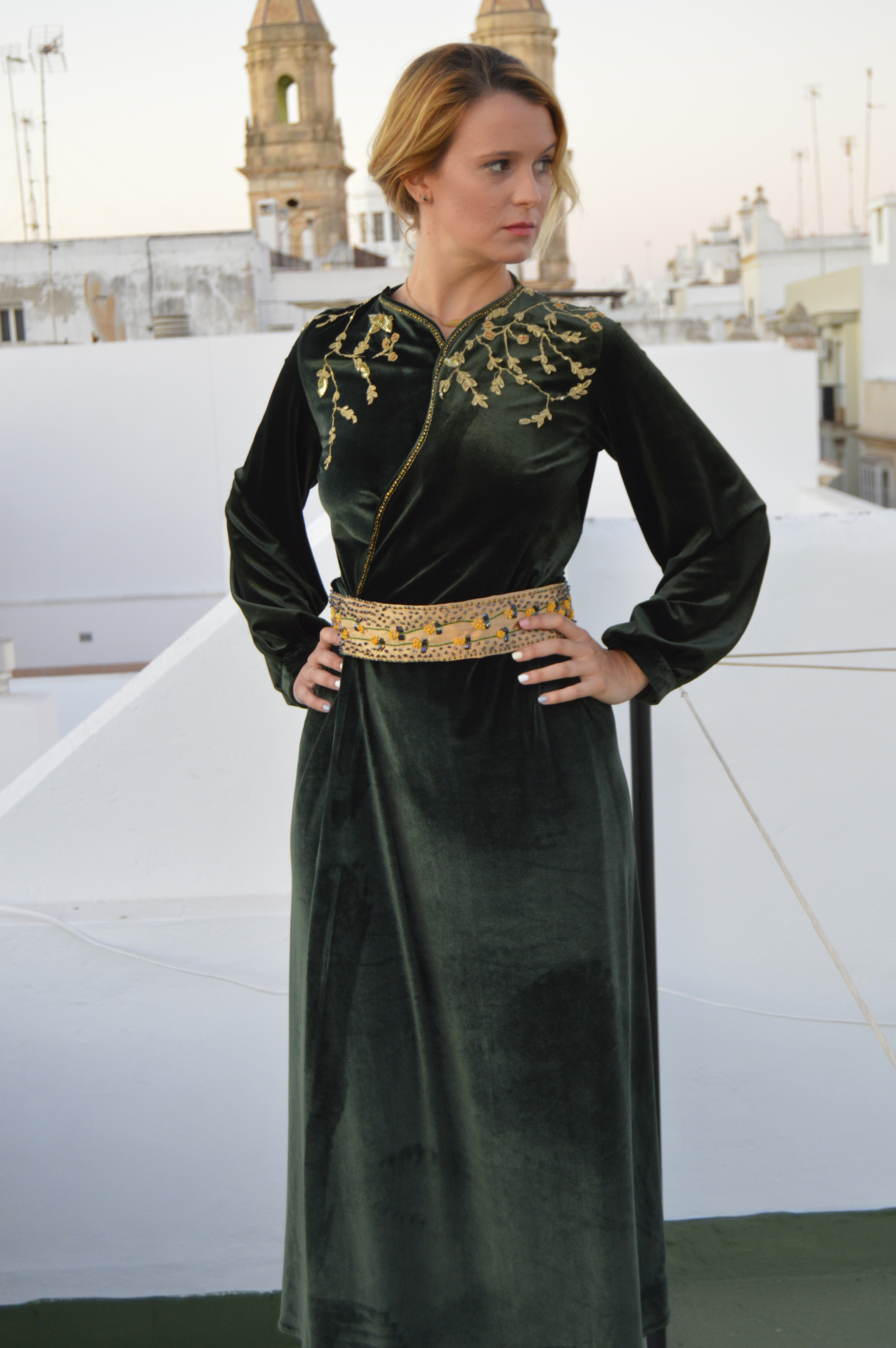Suave y elegante Smooth and elegant. Realizado en terciopelo verde y bordado a mano en hilo de oro. cinturón en crepé de seda dorado y bordado a mano con hilo de seda y pedrería. Made of green velvet and hand-embroidered with gold thread. Belt in golden silk crepe and hand-embroidered with silk thread and rhinestones.