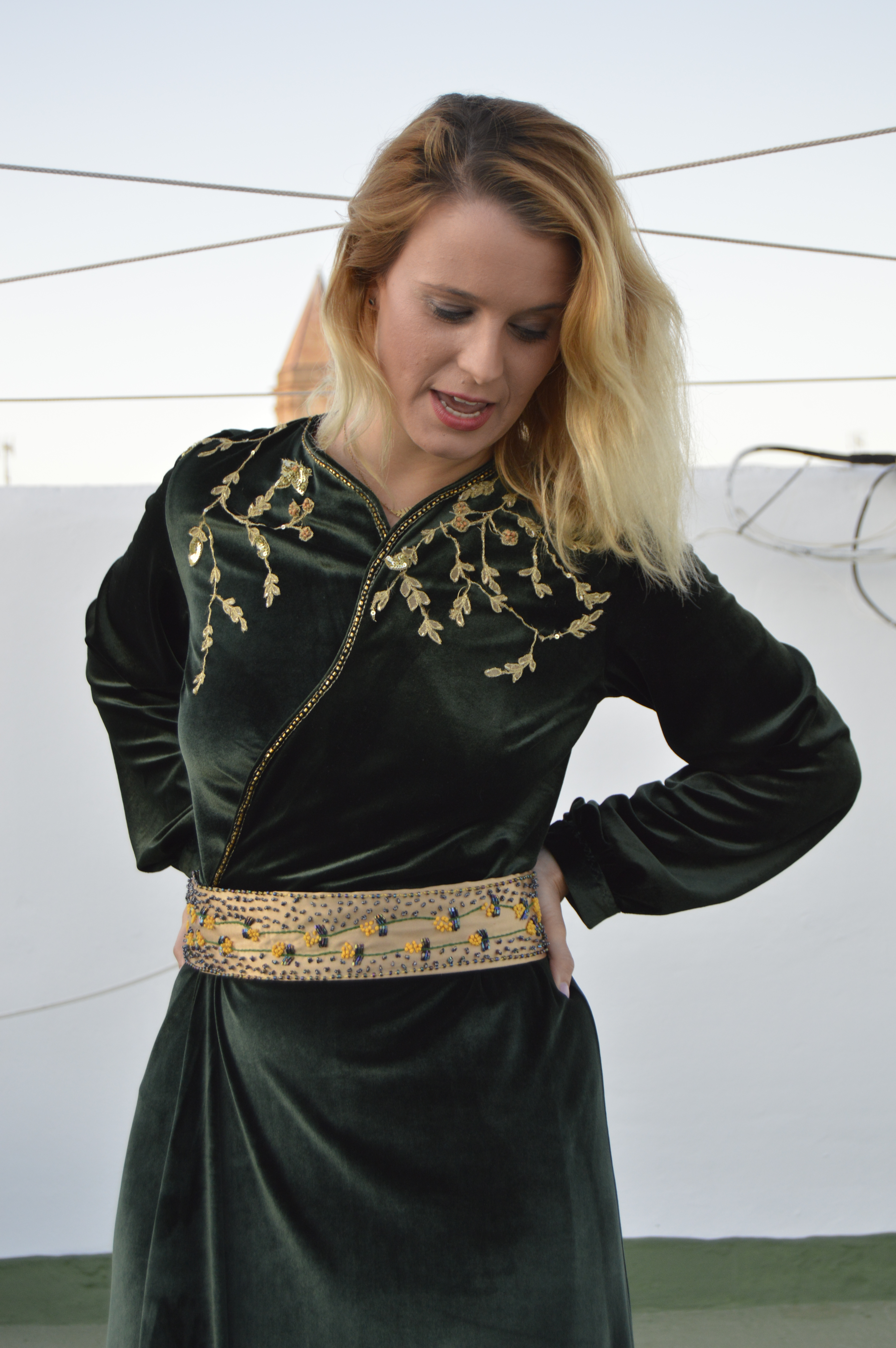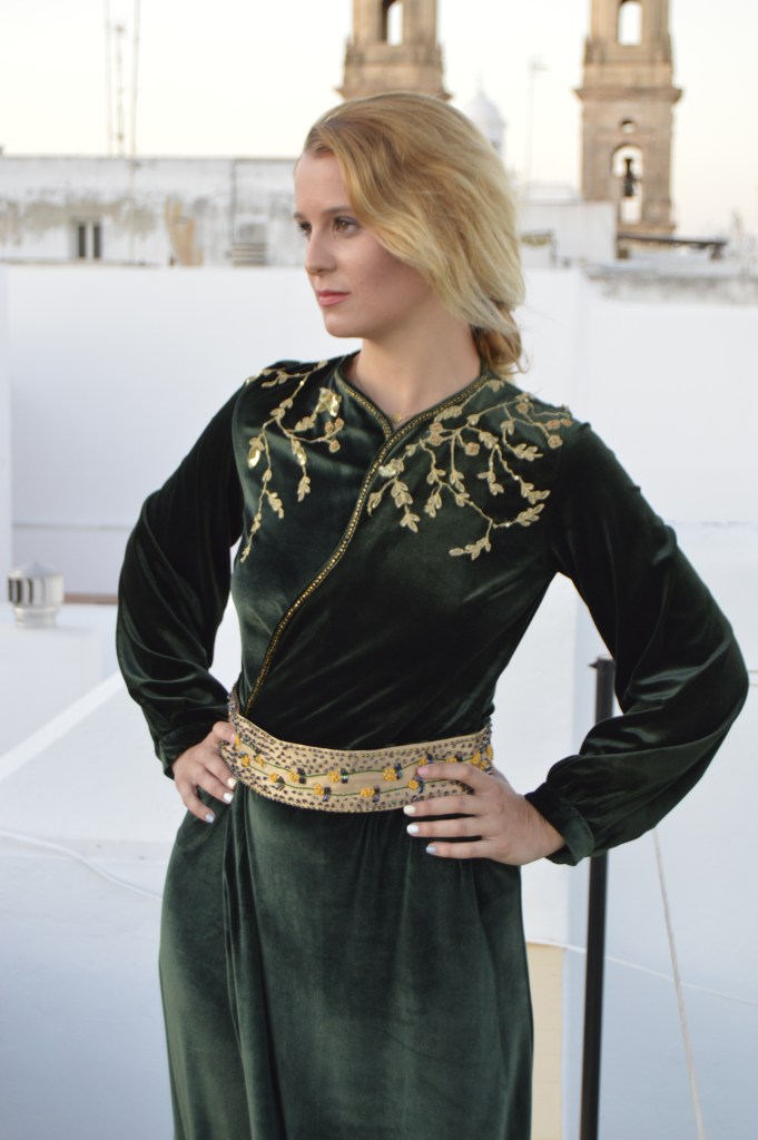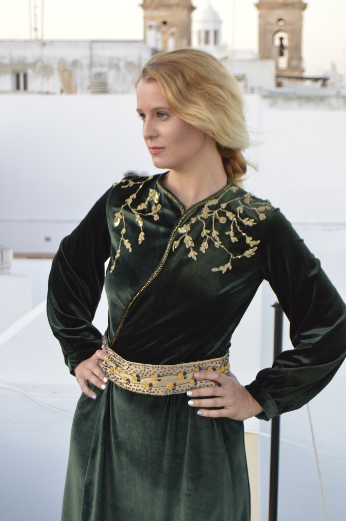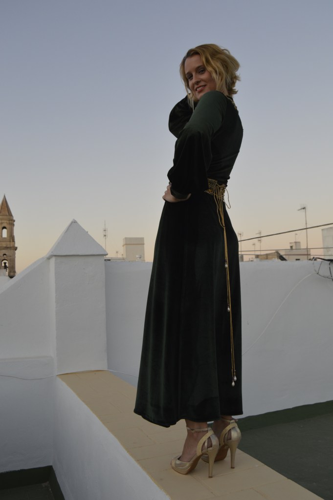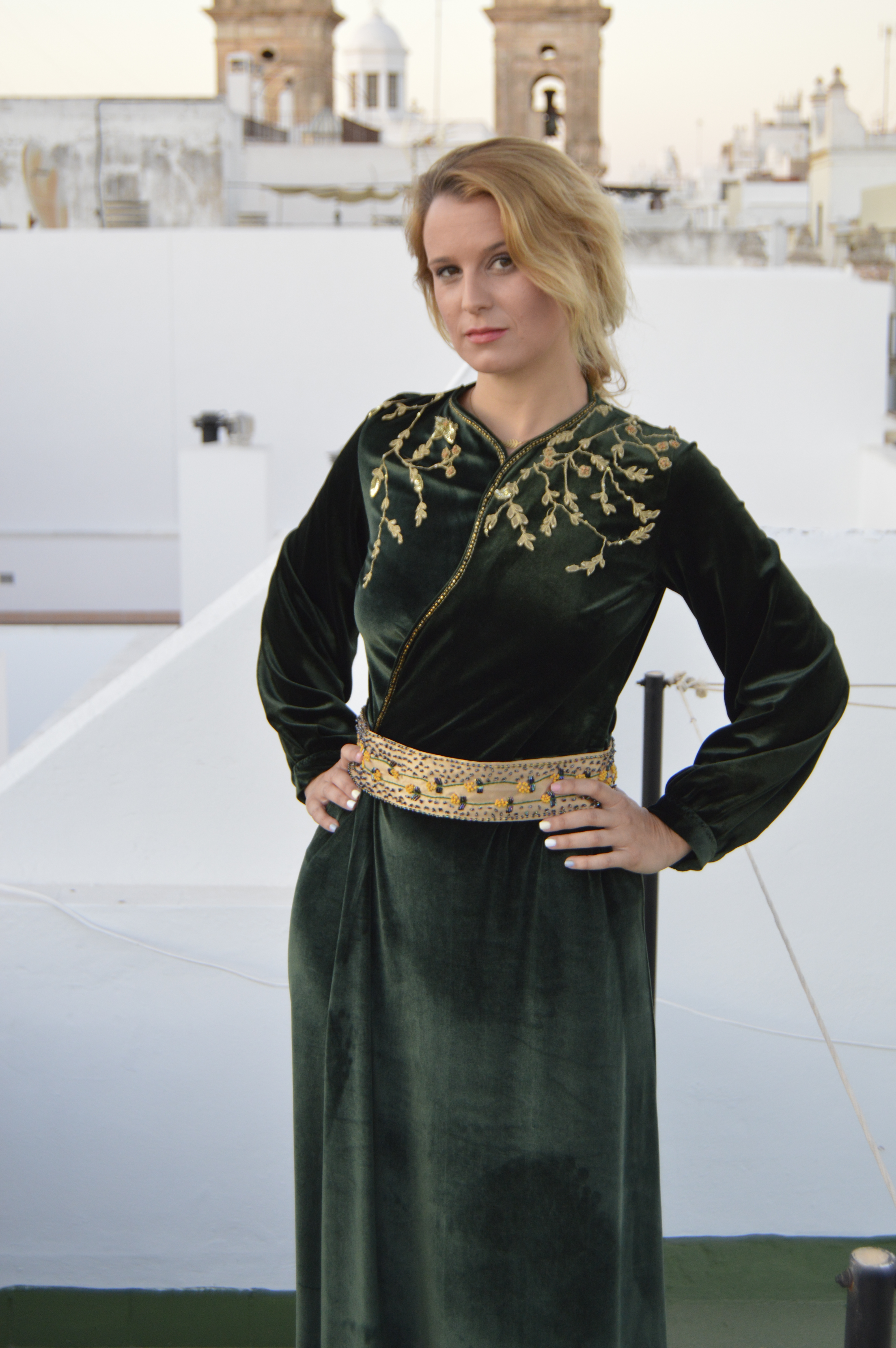 Suave y elegante Smooth and elegant. Realizado en terciopelo verde y bordado a mano en hilo de oro. cinturón en crepé de seda dorado y bordado a mano con hilo de seda y pedrería. Made of green velvet and hand-embroidered with gold thread. Belt in golden silk crepe and hand-embroidered with silk thread and rhinestones.