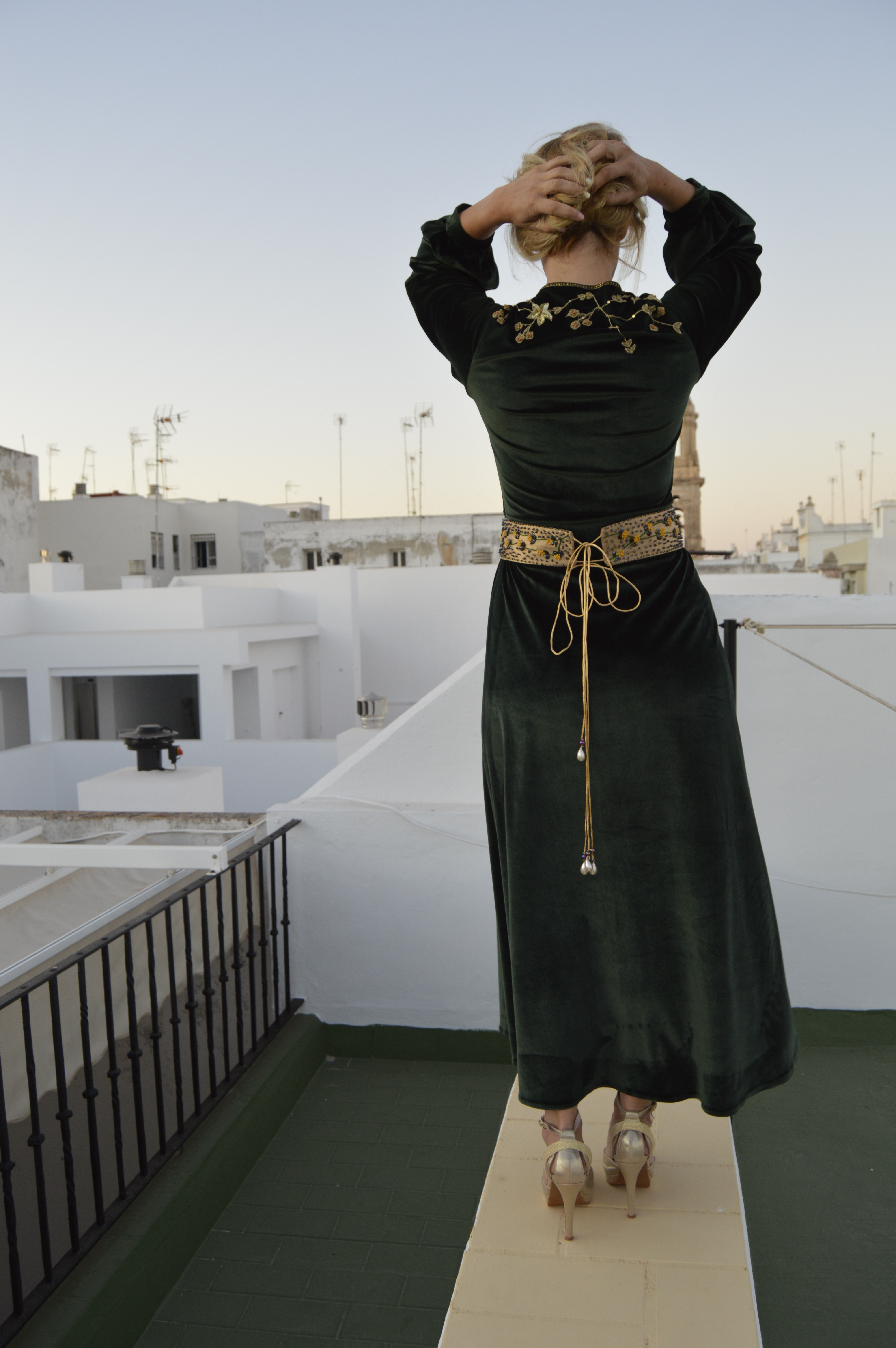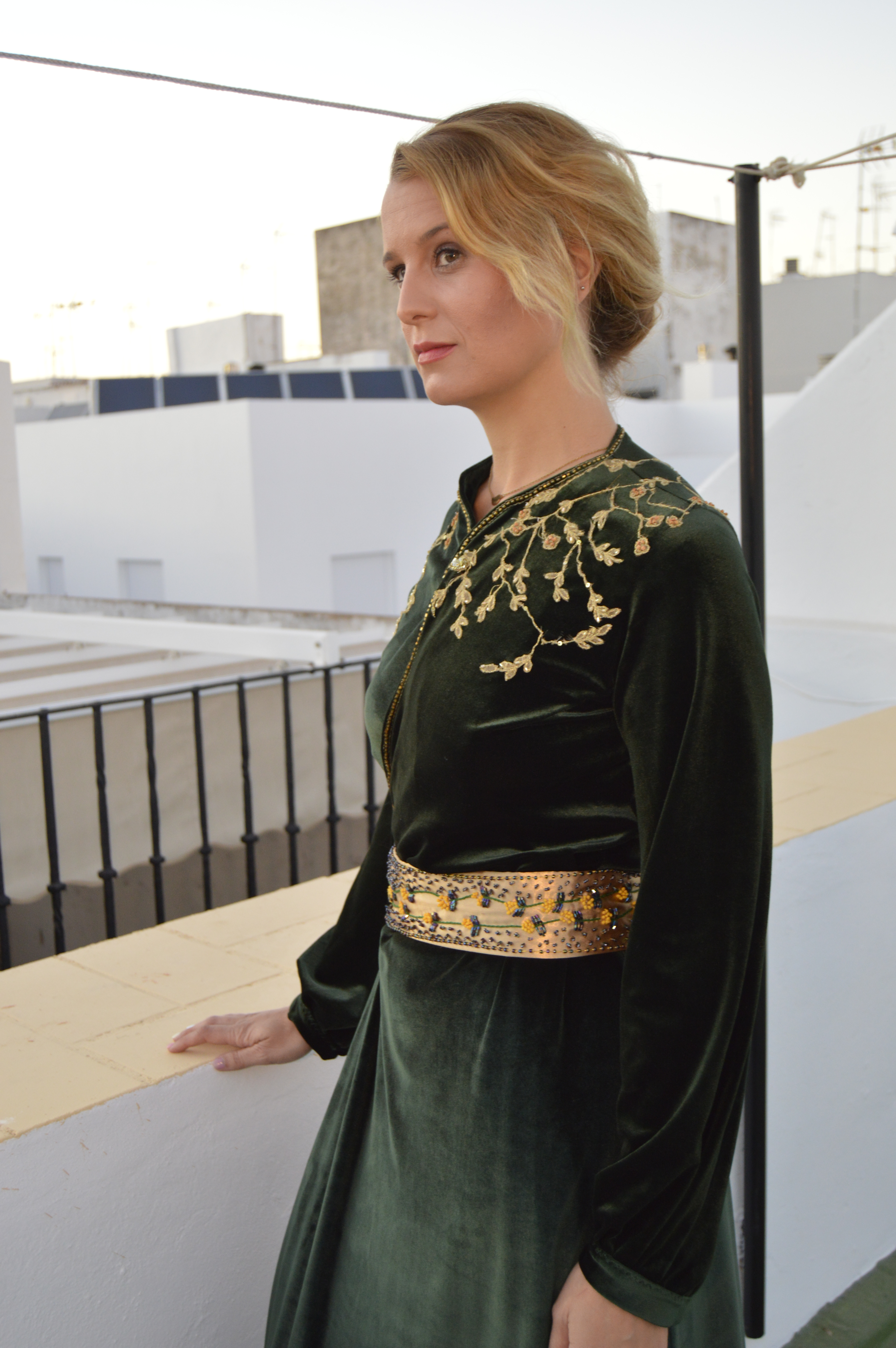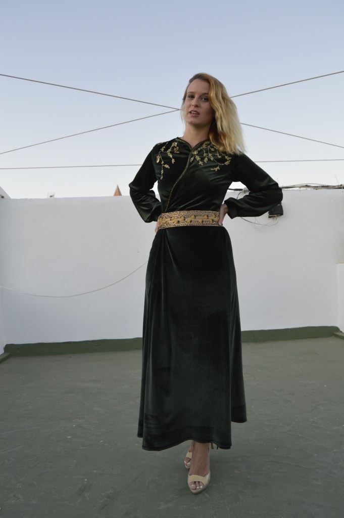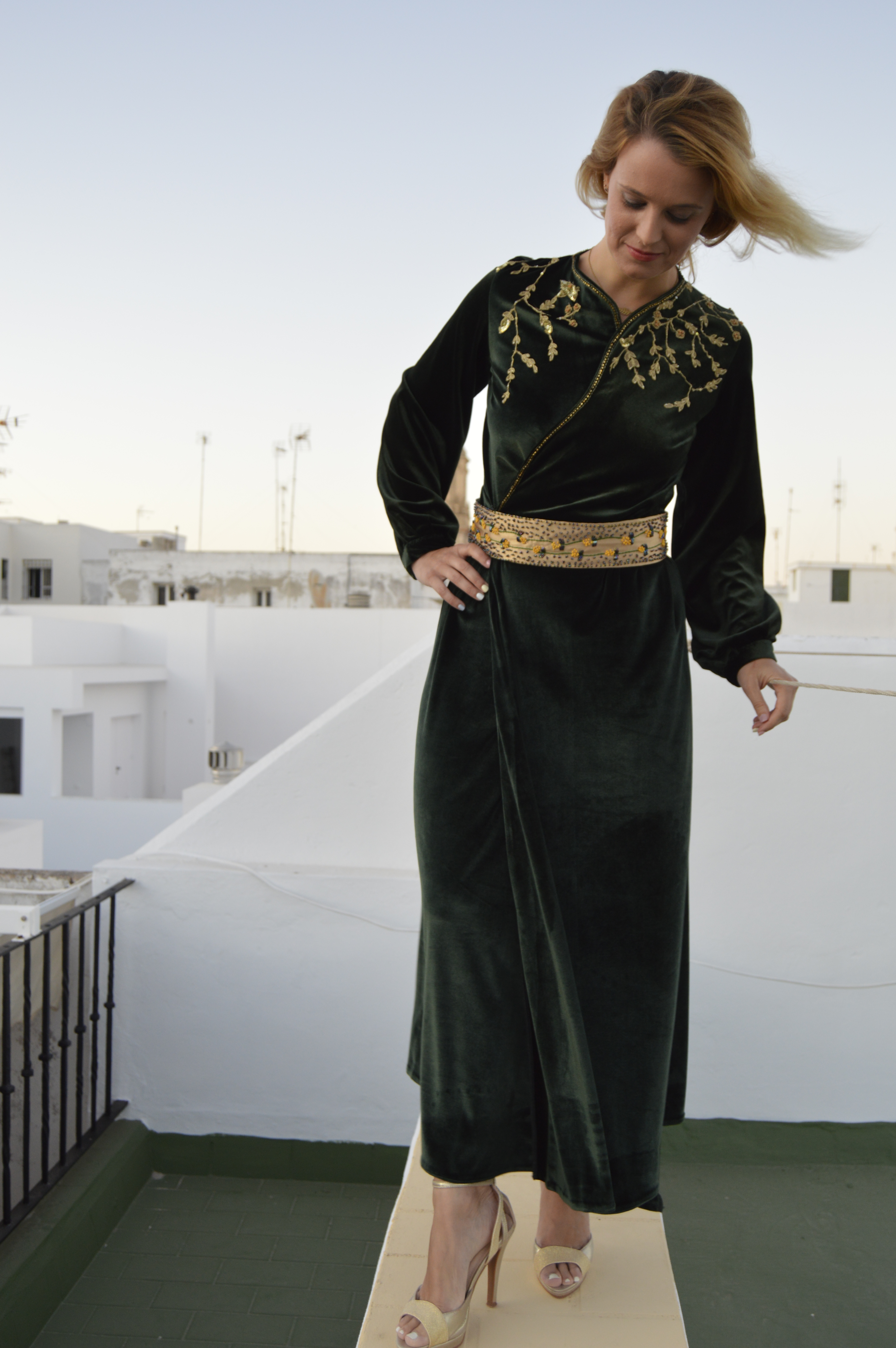 Suave y elegante Smooth and elegant. Realizado en terciopelo verde y bordado a mano en hilo de oro. cinturón en crepé de seda dorado y bordado a mano con hilo de seda y pedrería. Made of green velvet and hand-embroidered with gold thread. Belt in golden silk crepe and hand-embroidered with silk thread and rhinestones.