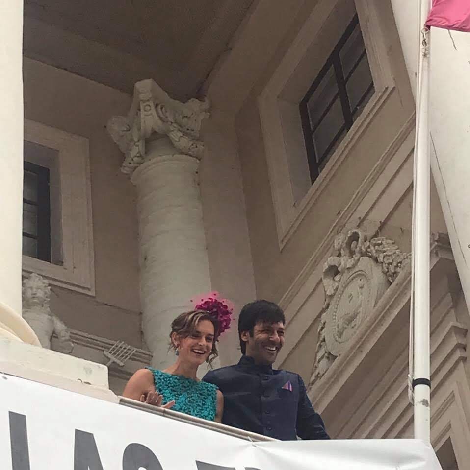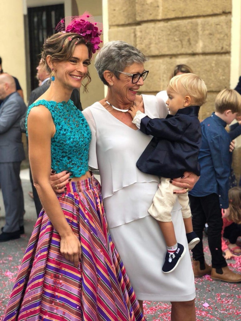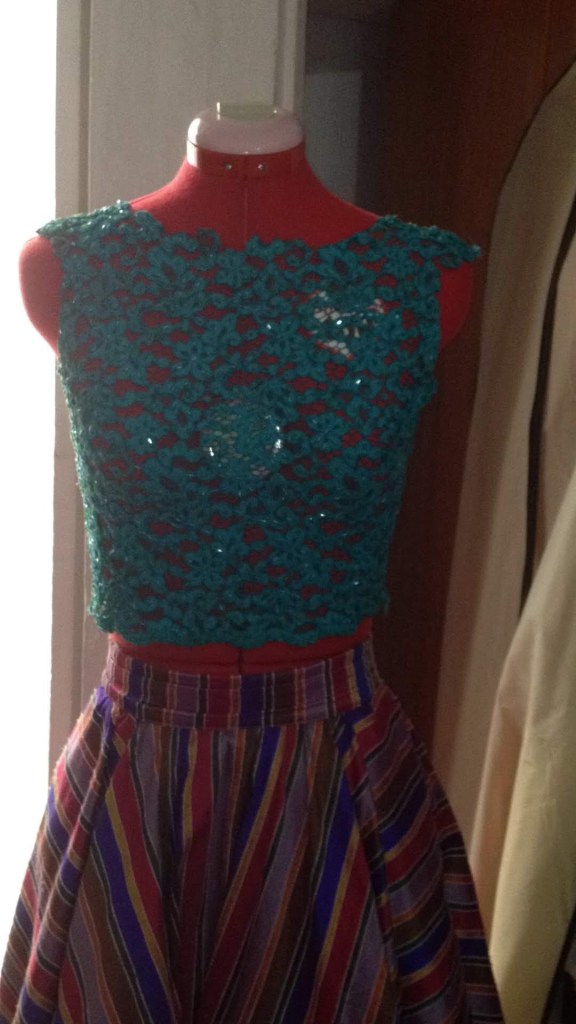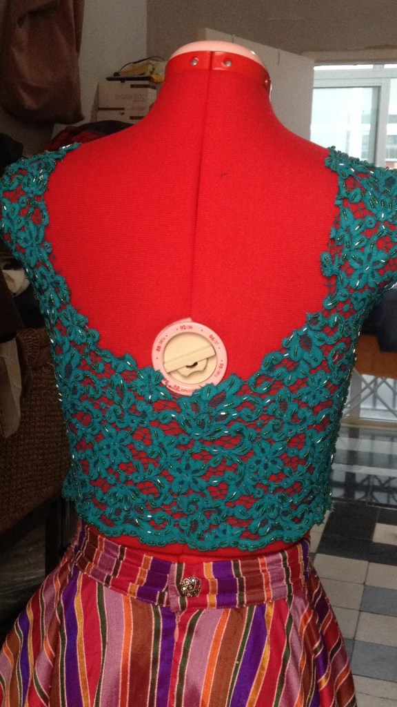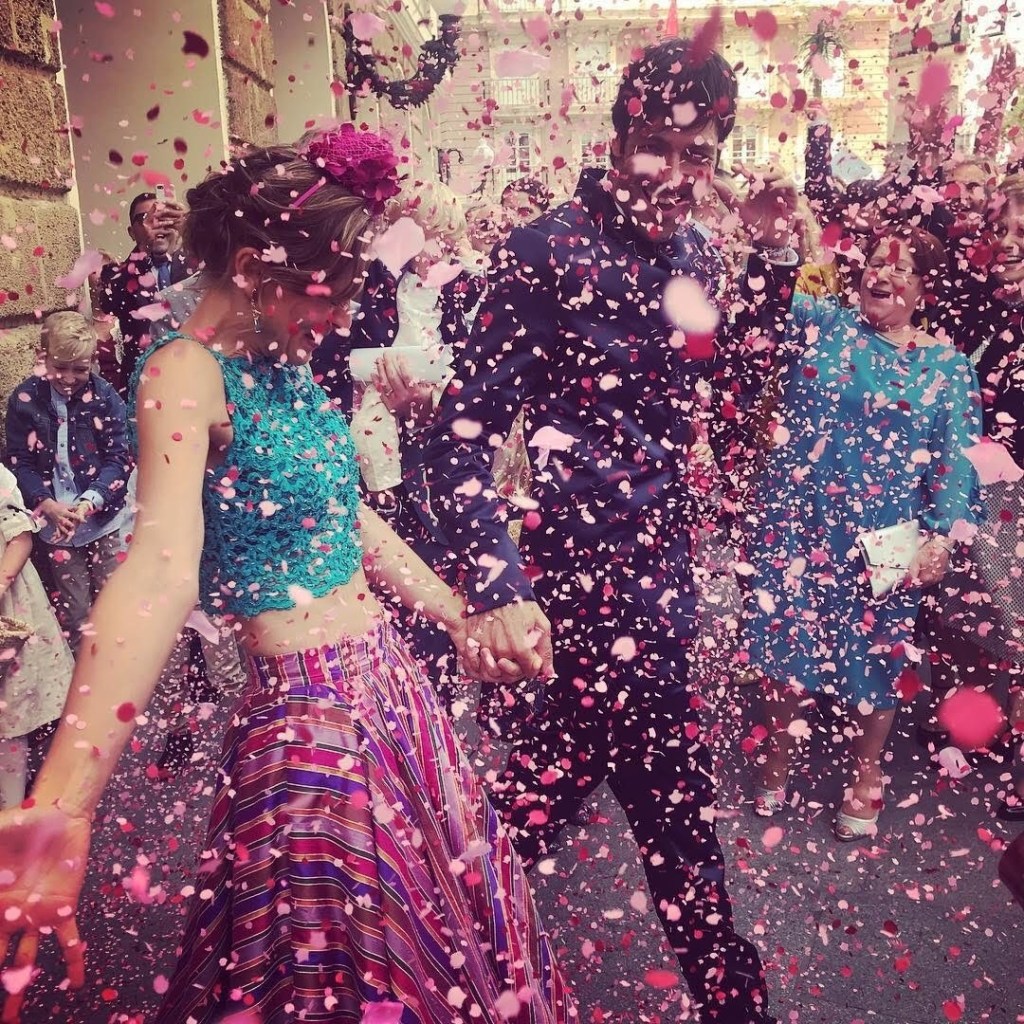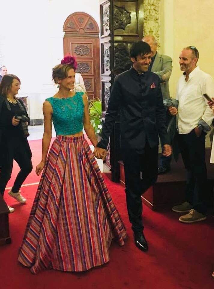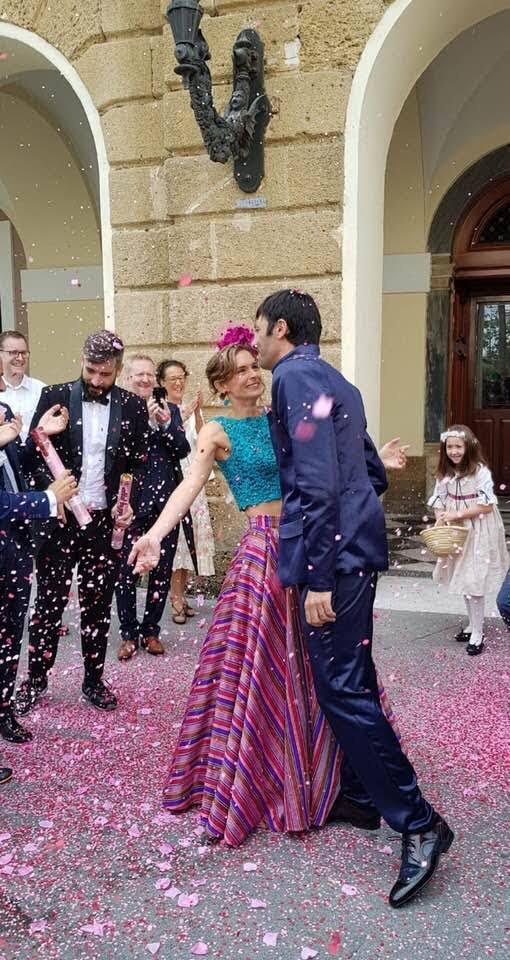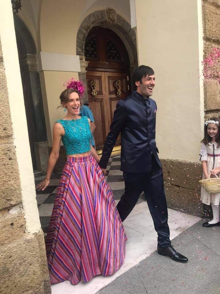 Una novia muy alegre y colorida. A very cheerful and colourful brinde. Falda exclusiva y única en seda salvaje multicolor. Croo top realizado en encaje de shantung, bordado a mano con cristales. Exclusive and uni que skirt in multicolores wild silk. Croop top made of shantung lace, hand- embroidered with crystals.