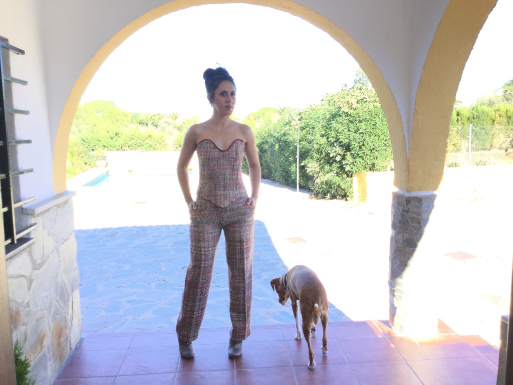 Un traje de lana diferente. A different kind of wool suit. Pantalón pitillo, ajustado al cuerpo. corsé con faldón y cierre de cordones. Skinny trousers tight to the body. Corset with skirt and lace-up closure.