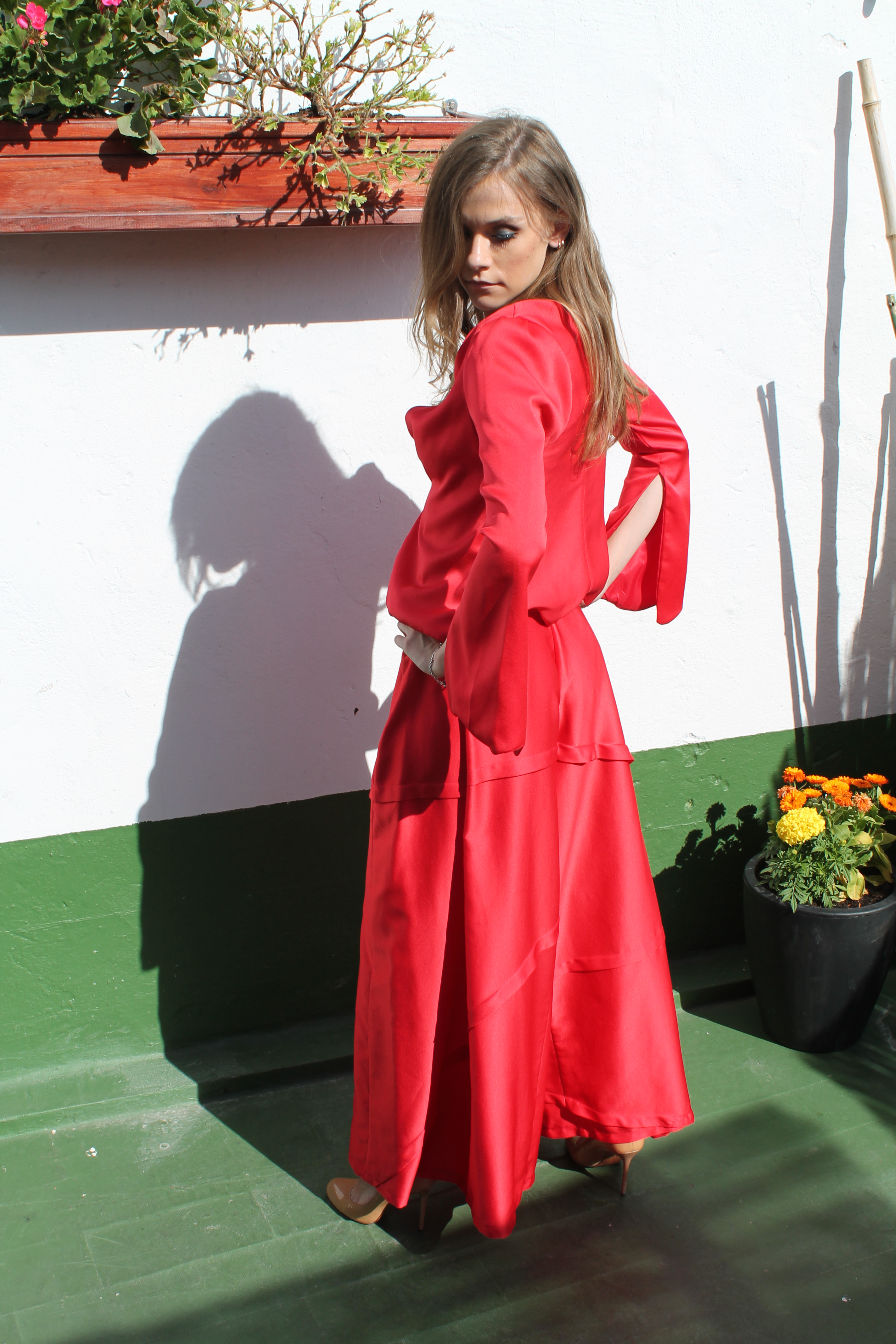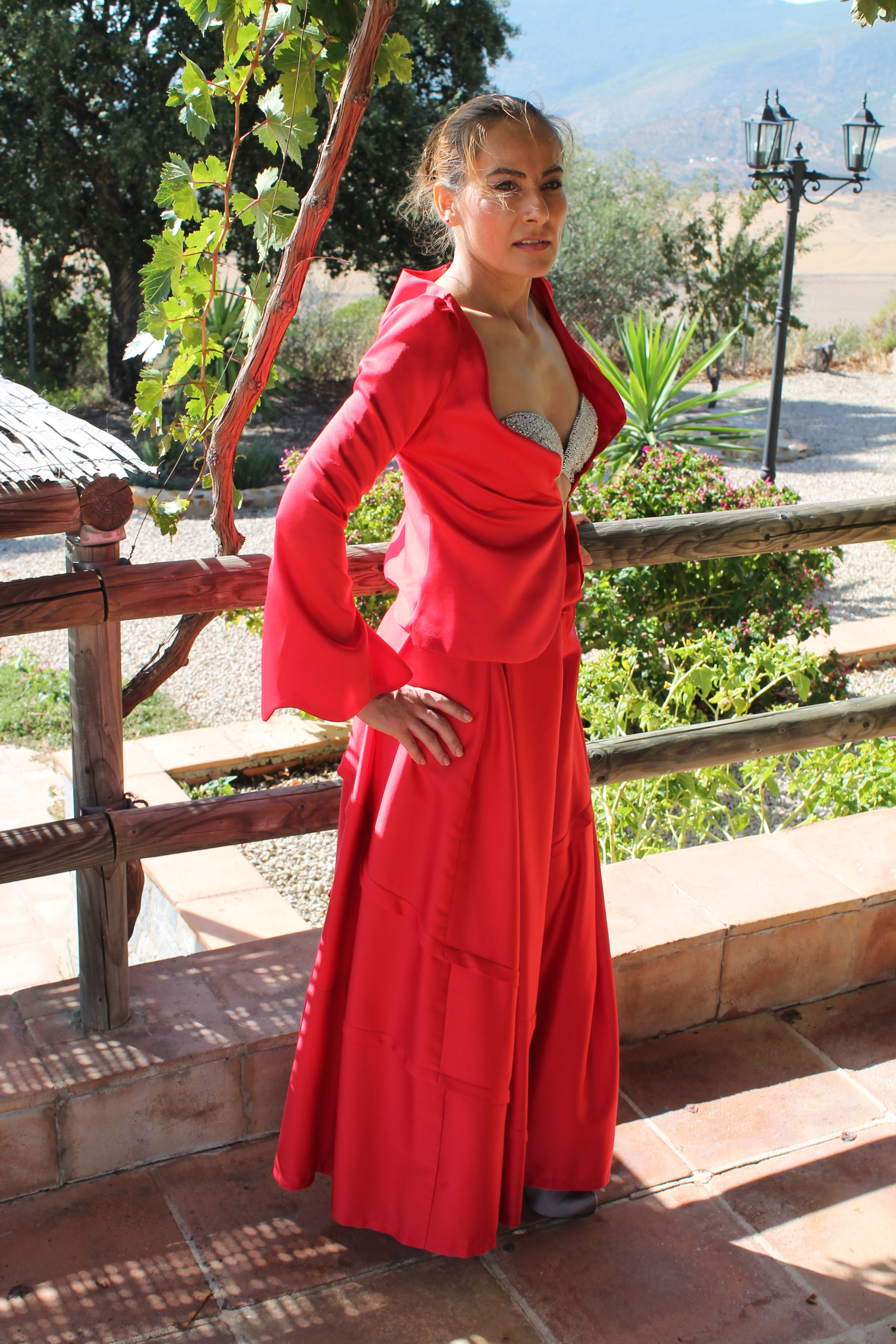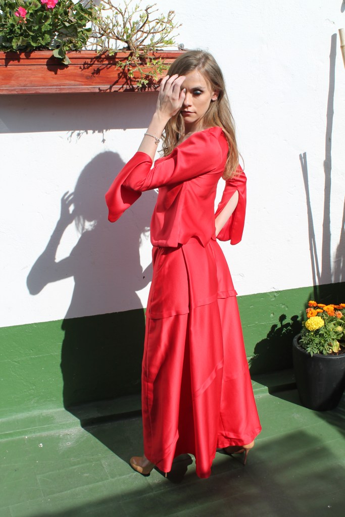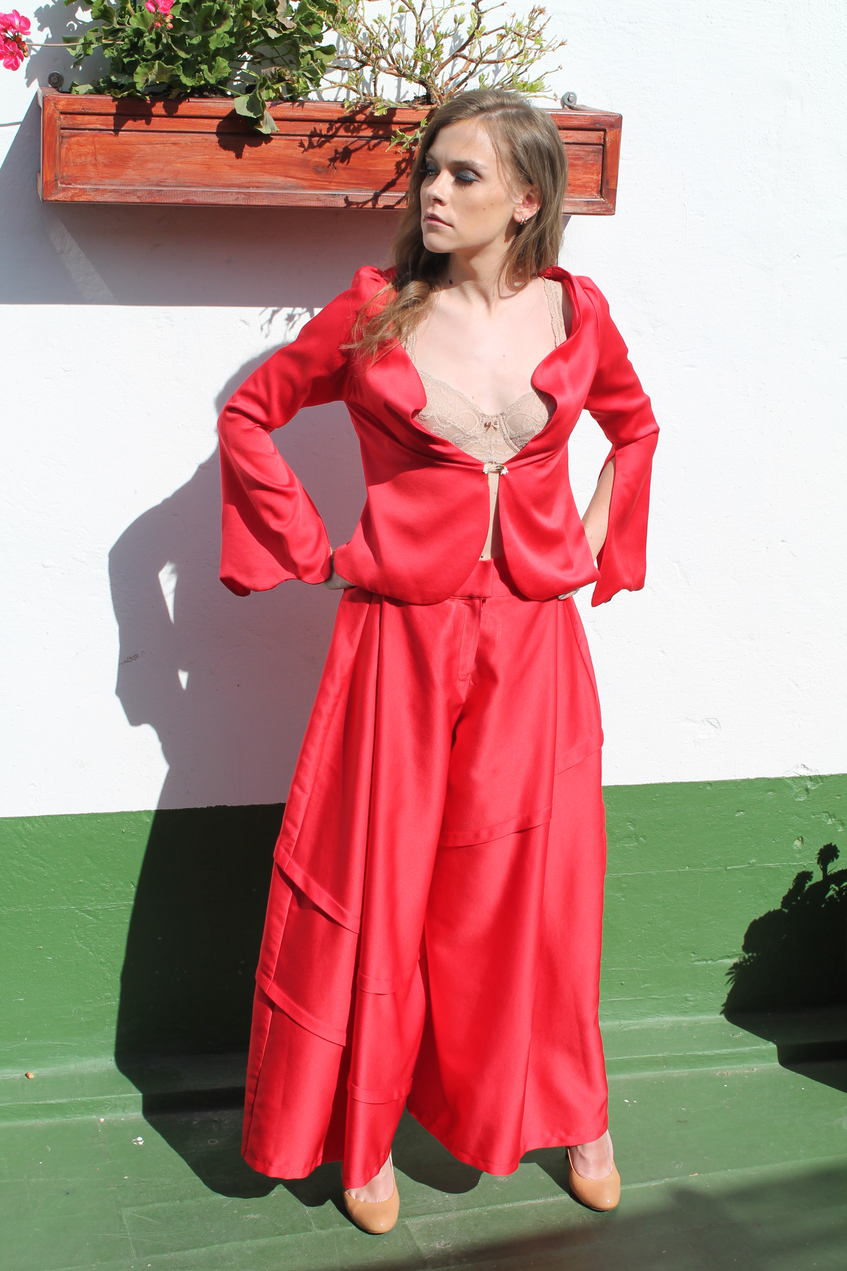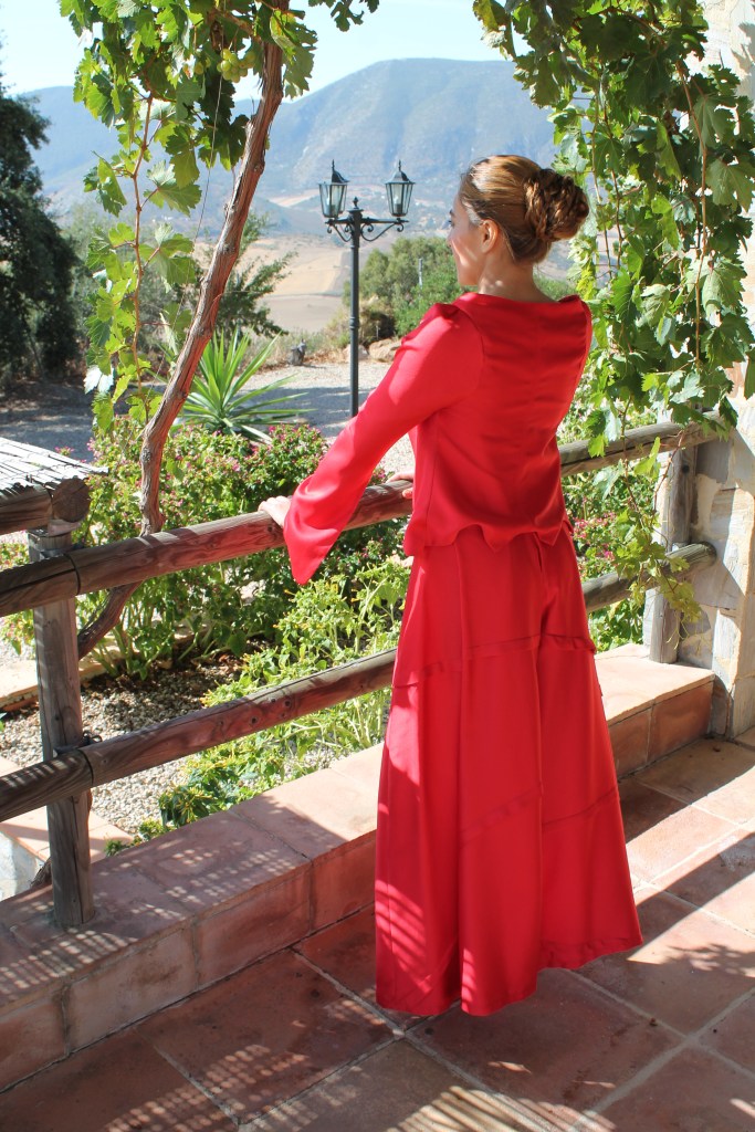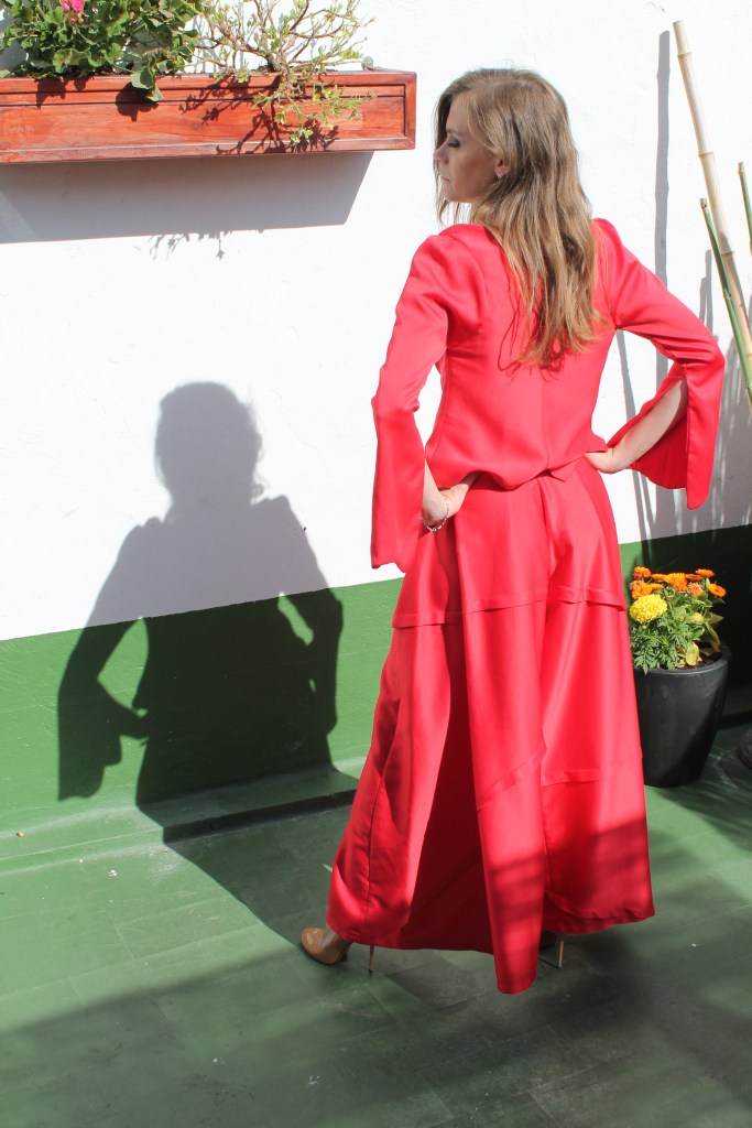 Rojo otoñal Autumn red Traje realizado en crèpe, pantalón palazo. Chaquetilla tipo torera. Suit made of crêpe, palazo trousers. Bullfighter jacket.