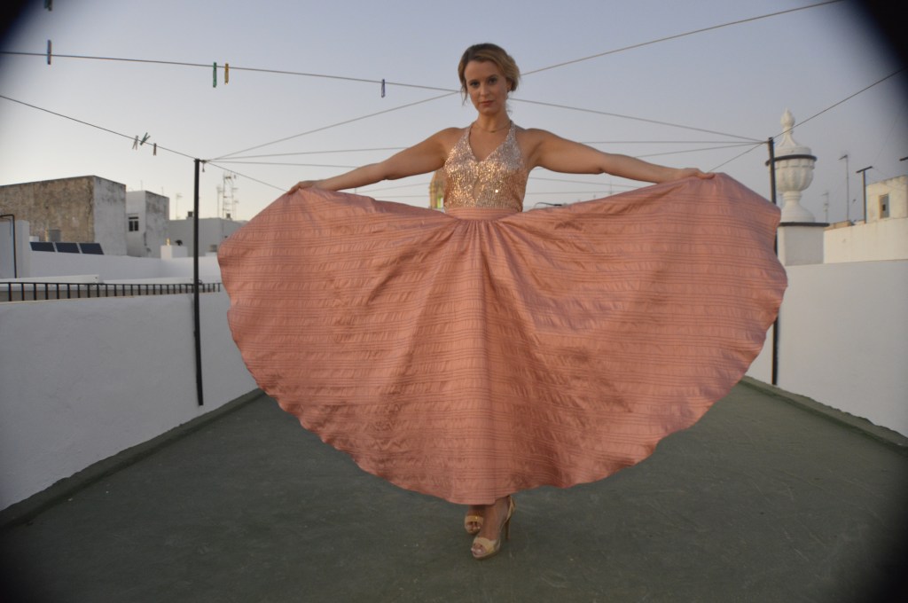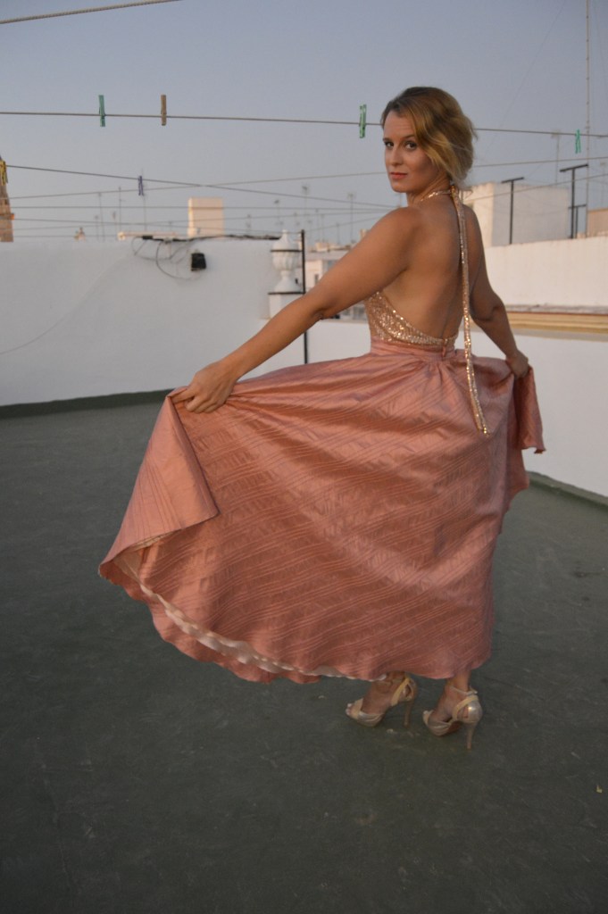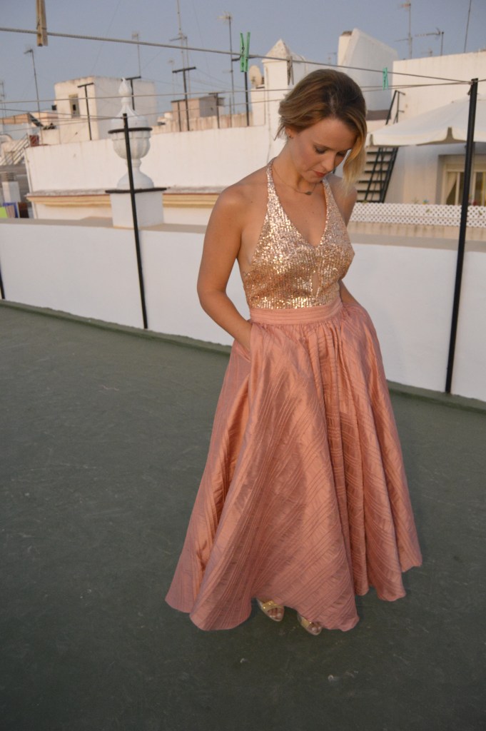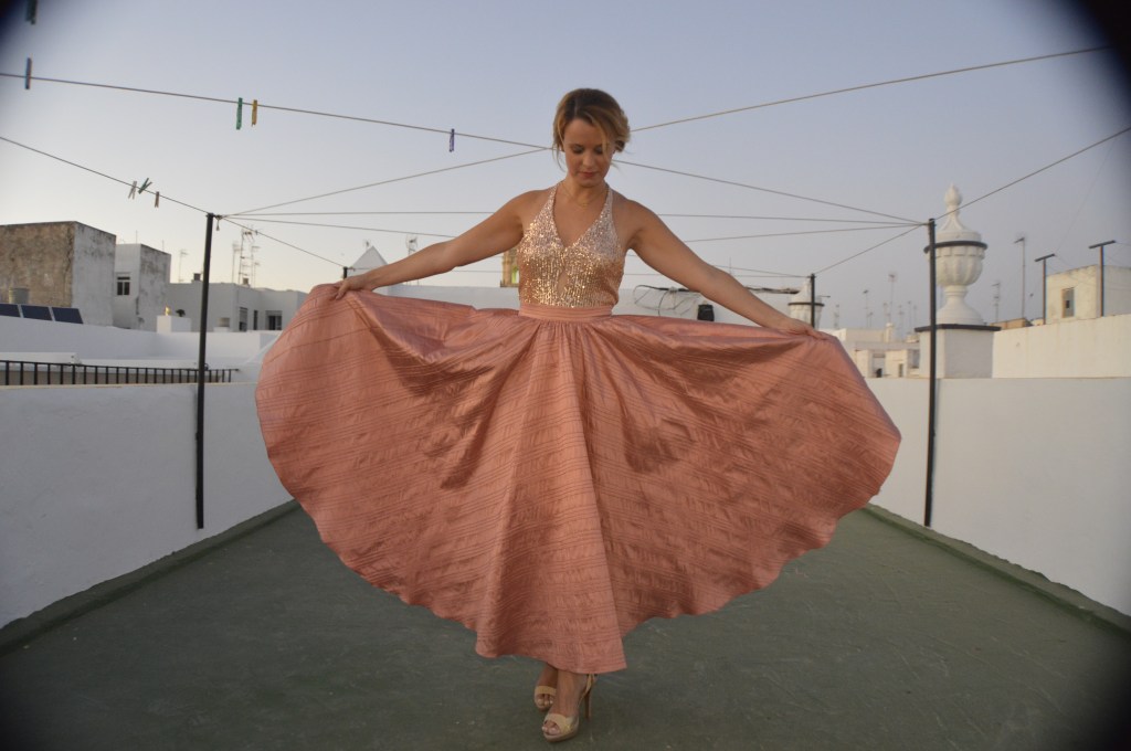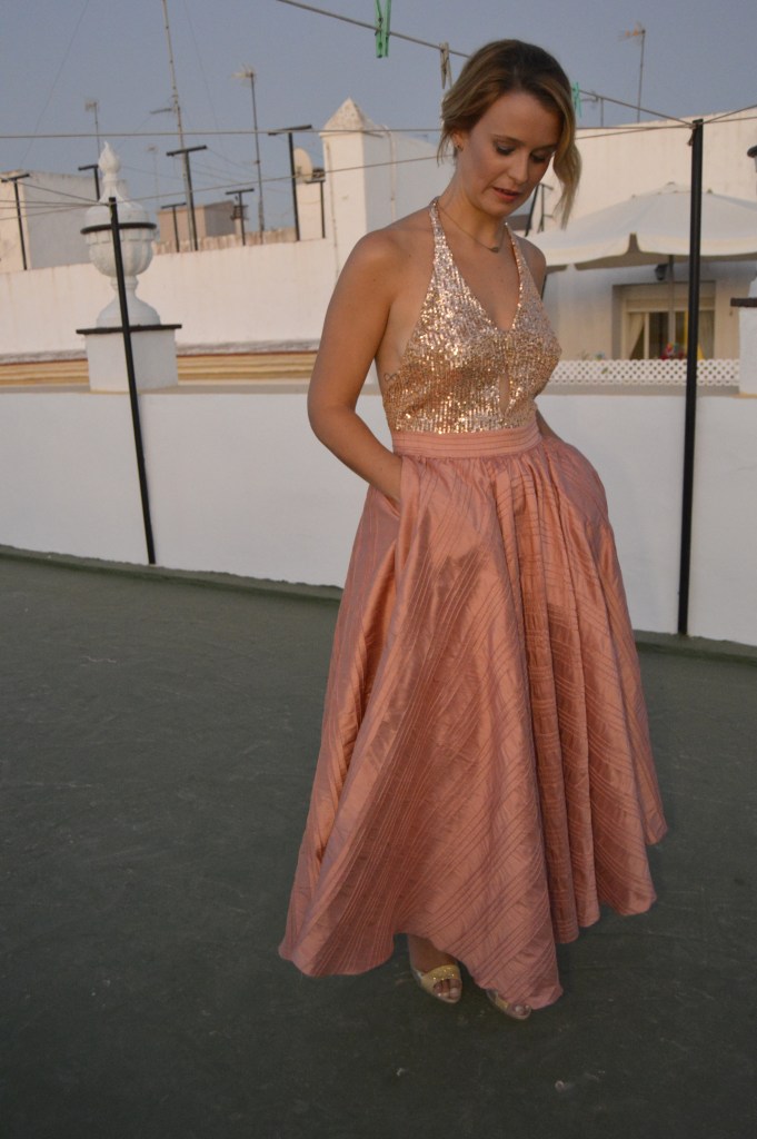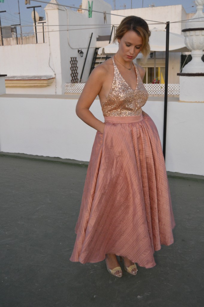 Lentejuelas y seda salvaje. Sequins and wild silk. Falda circular en seda salvaje, rosa palo. Top en lentejuela rosa palo y espalda al aire. Circular skirt in wild silk, pale pink. Top in pale pink sequin and open back. http://silvia_arrieta_fashiondesign