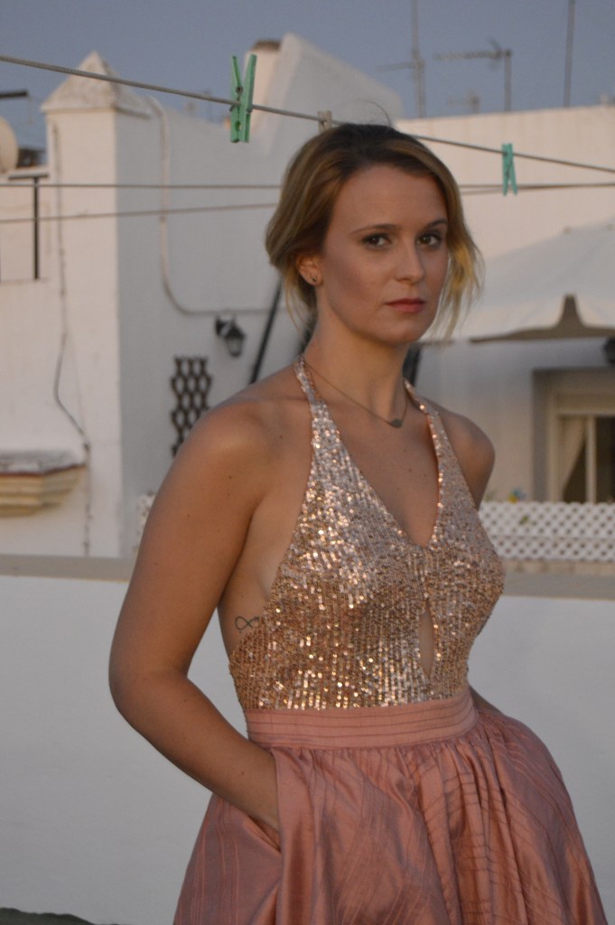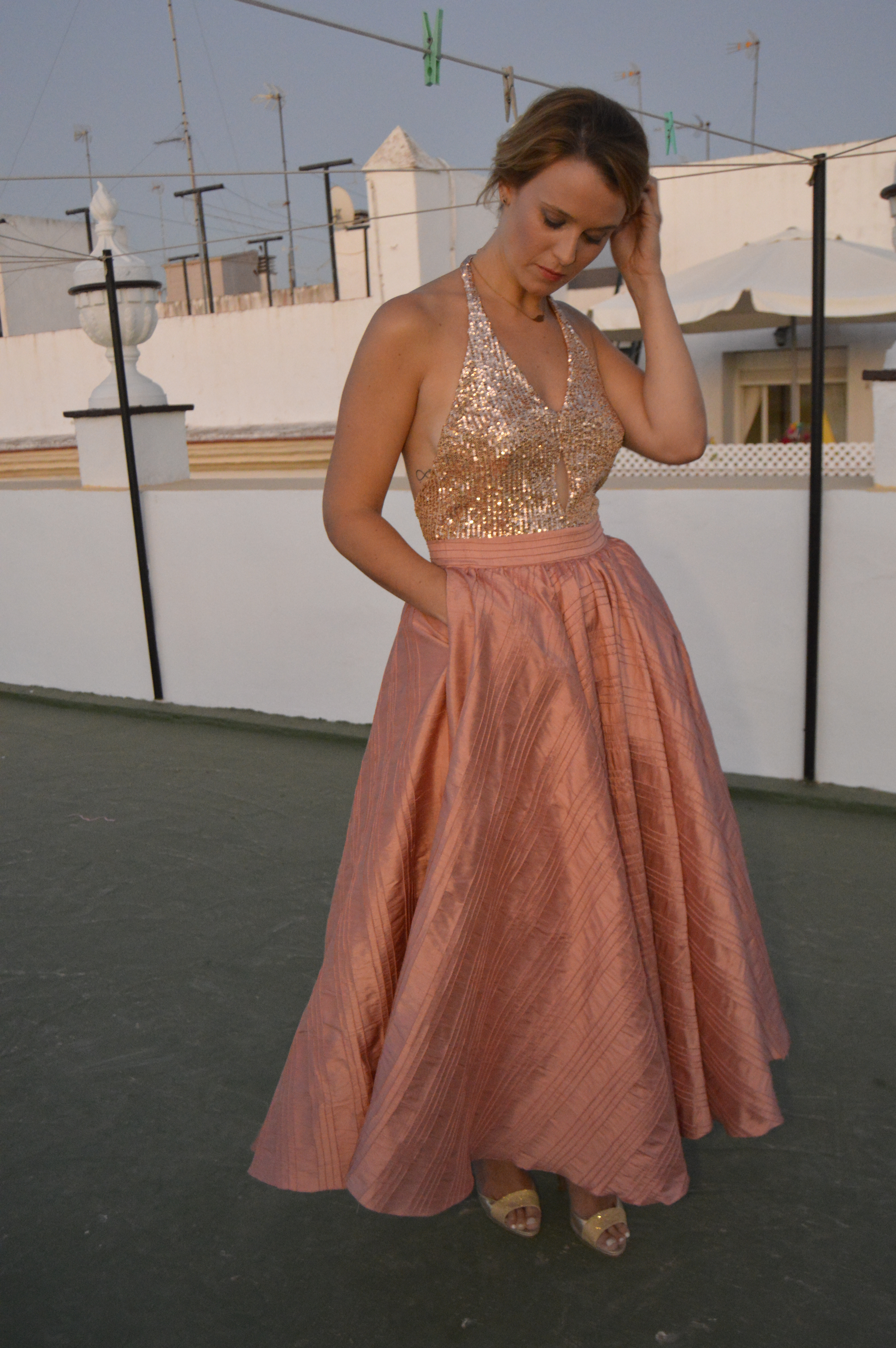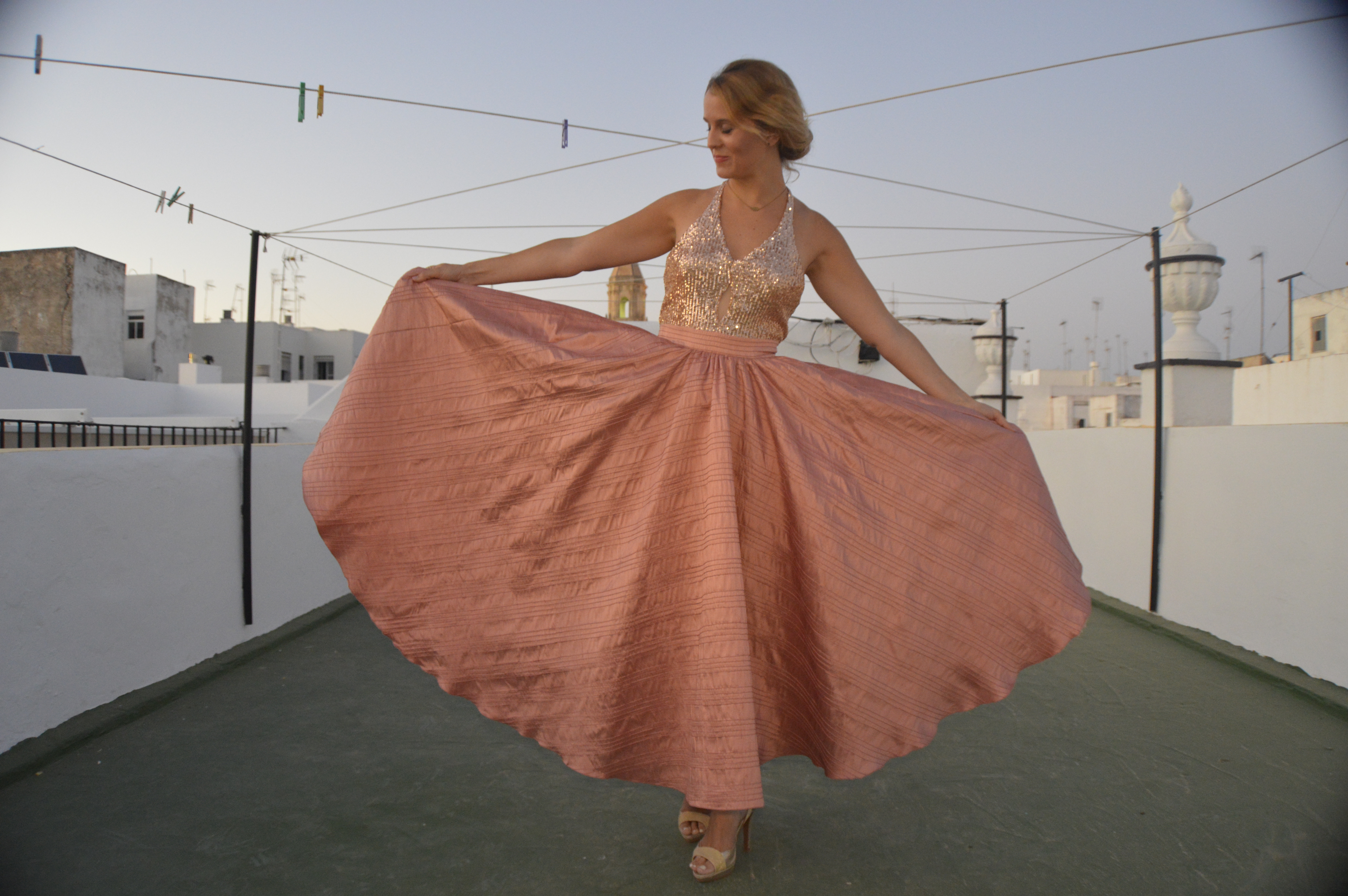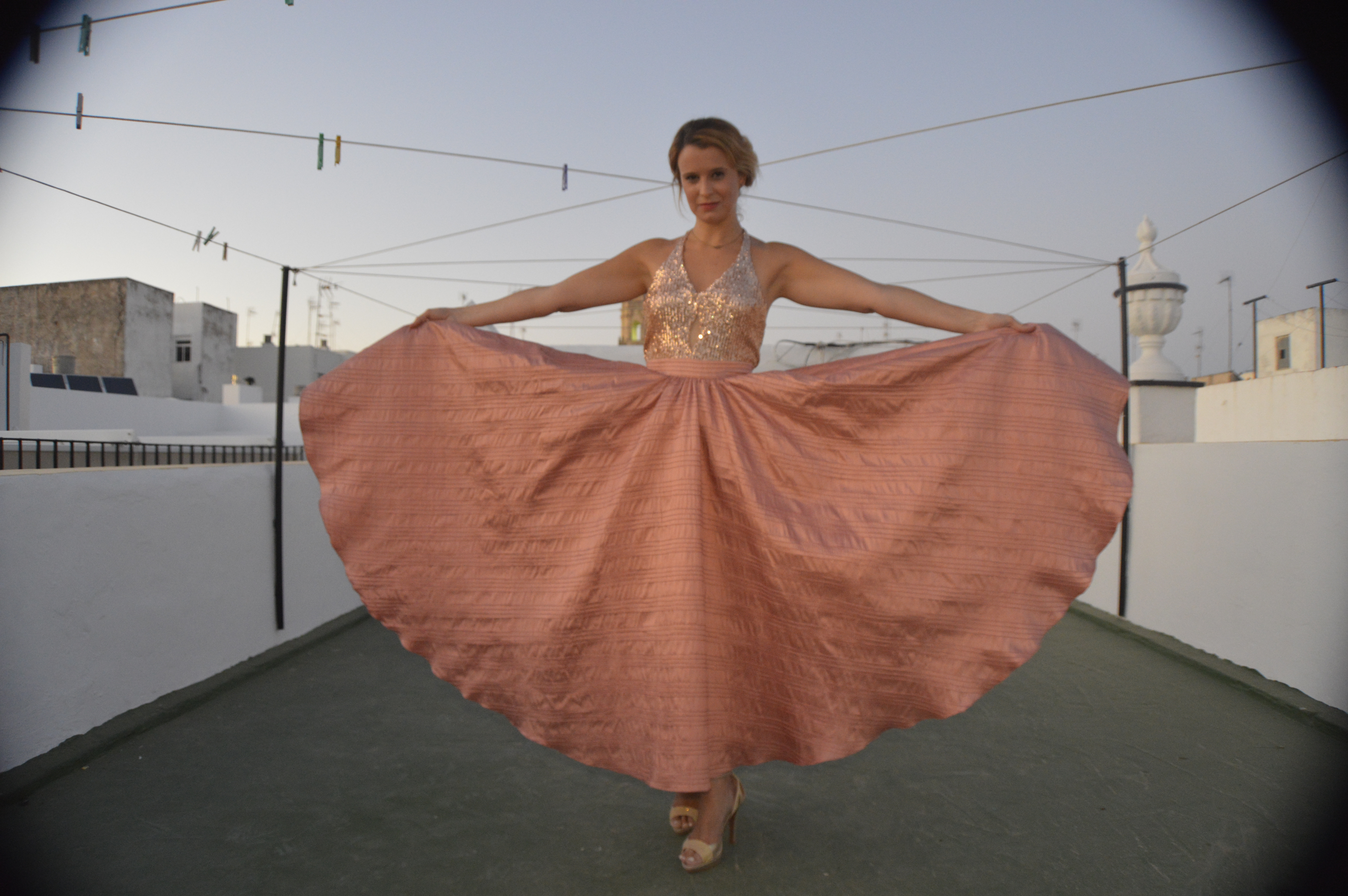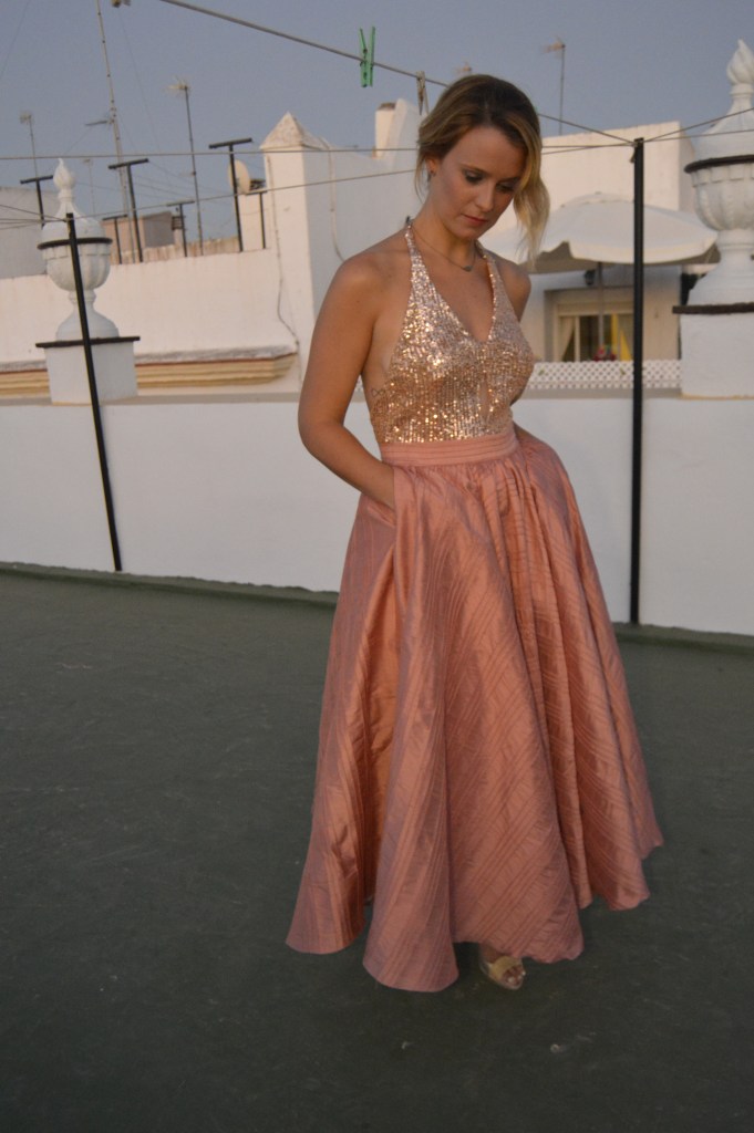 Lentejuelas y seda salvaje. Sequins and wild silk. Falda circular en seda salvaje, rosa palo. Top en lentejuela rosa palo y espalda al aire. Circular skirt in wild silk, pale pink. Top in pale pink sequin and open back. http://silvia_arrieta_fashiondesign