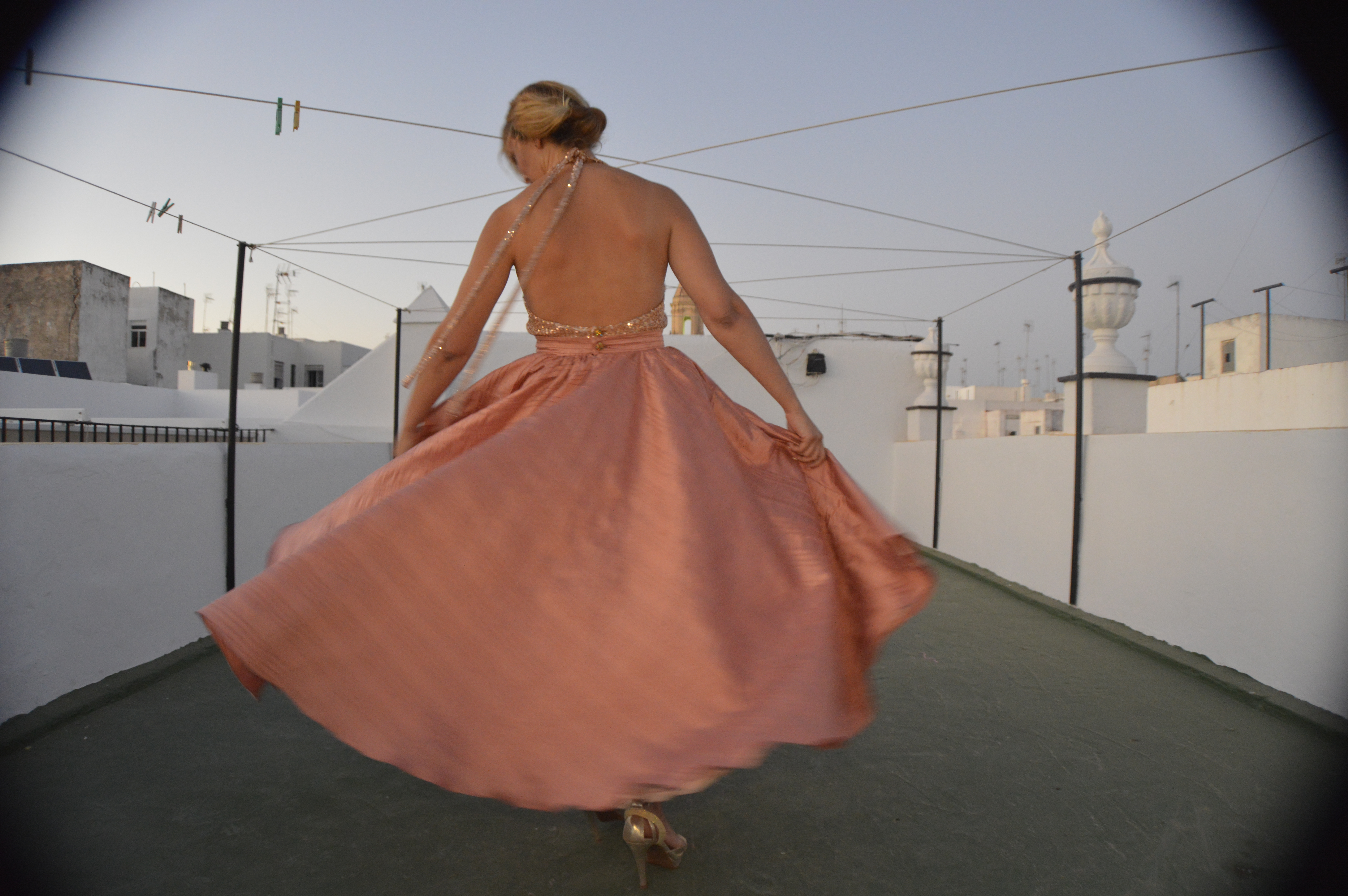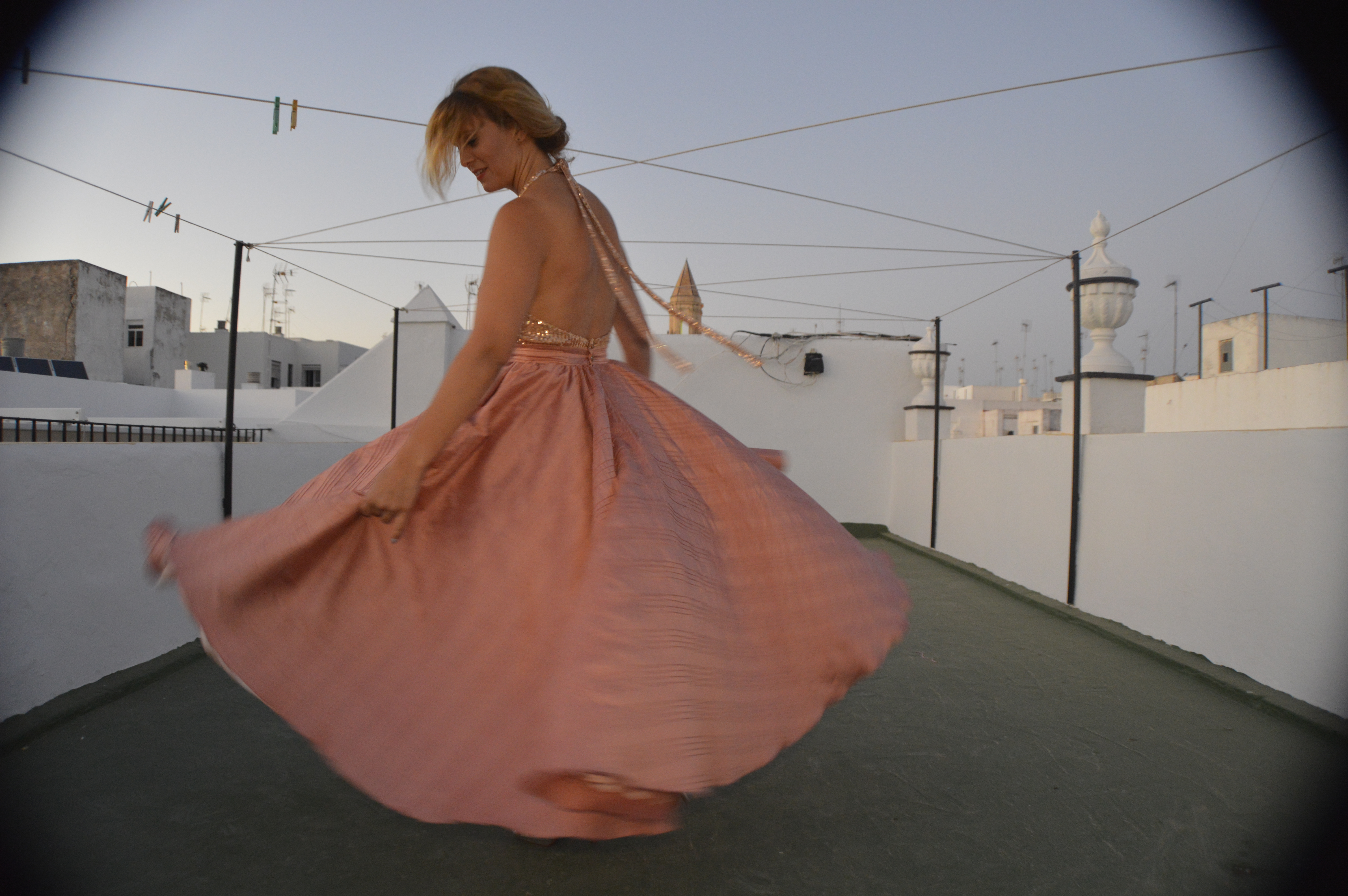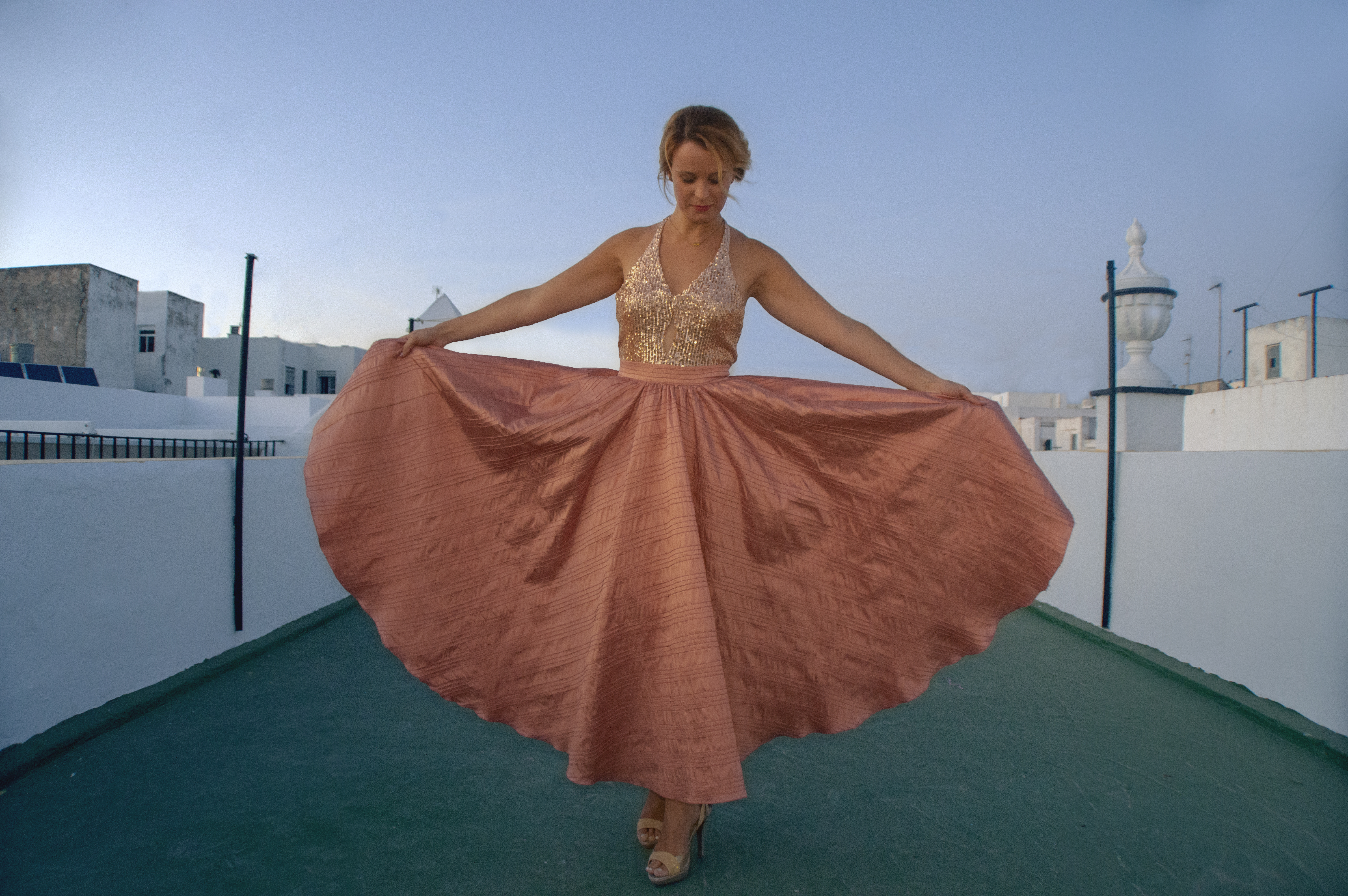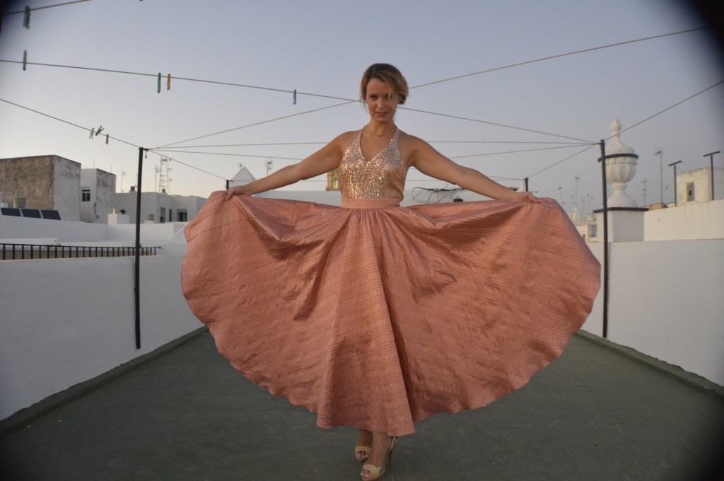 Lentejuelas y seda salvaje. Sequins and wild silk. Falda circular en seda salvaje, rosa palo. Top en lentejuela rosa palo y espalda al aire. Circular skirt in wild silk, pale pink. Top in pale pink sequin and open back. http://silvia_arrieta_fashiondesign