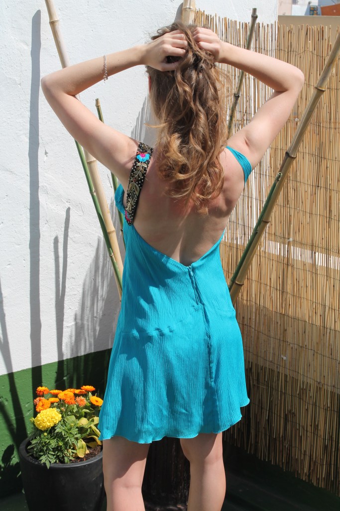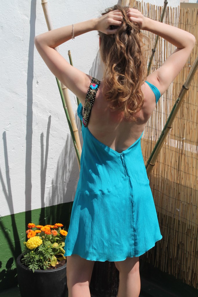 Bámbula azul Blue bambula. Vestido de cóctel en bámbula de seda con espalda al aire. Variación en los tirantes, flores realizadas a mano en seda rosa y plumas. Versión con tirantes bordados con hilo de seda y oro, en seda salvaje negra. Silk bamboo cocktail dress with open back. Variation on the straps, handmade flowers in pink silk and feathers. Version with silk and gold thread embroidered shoulder straps, in black wild silk.