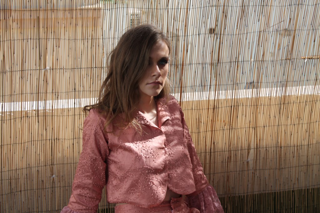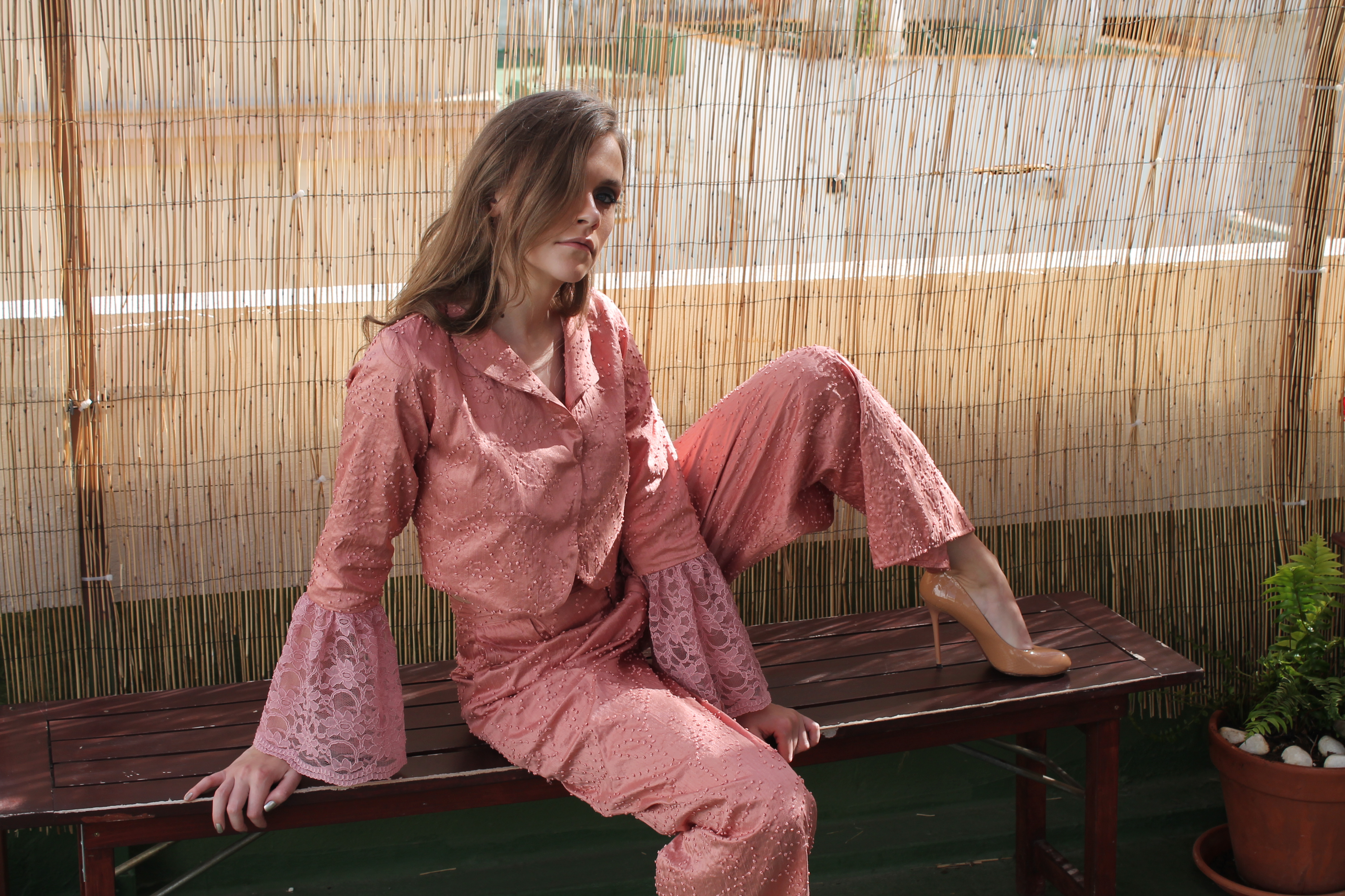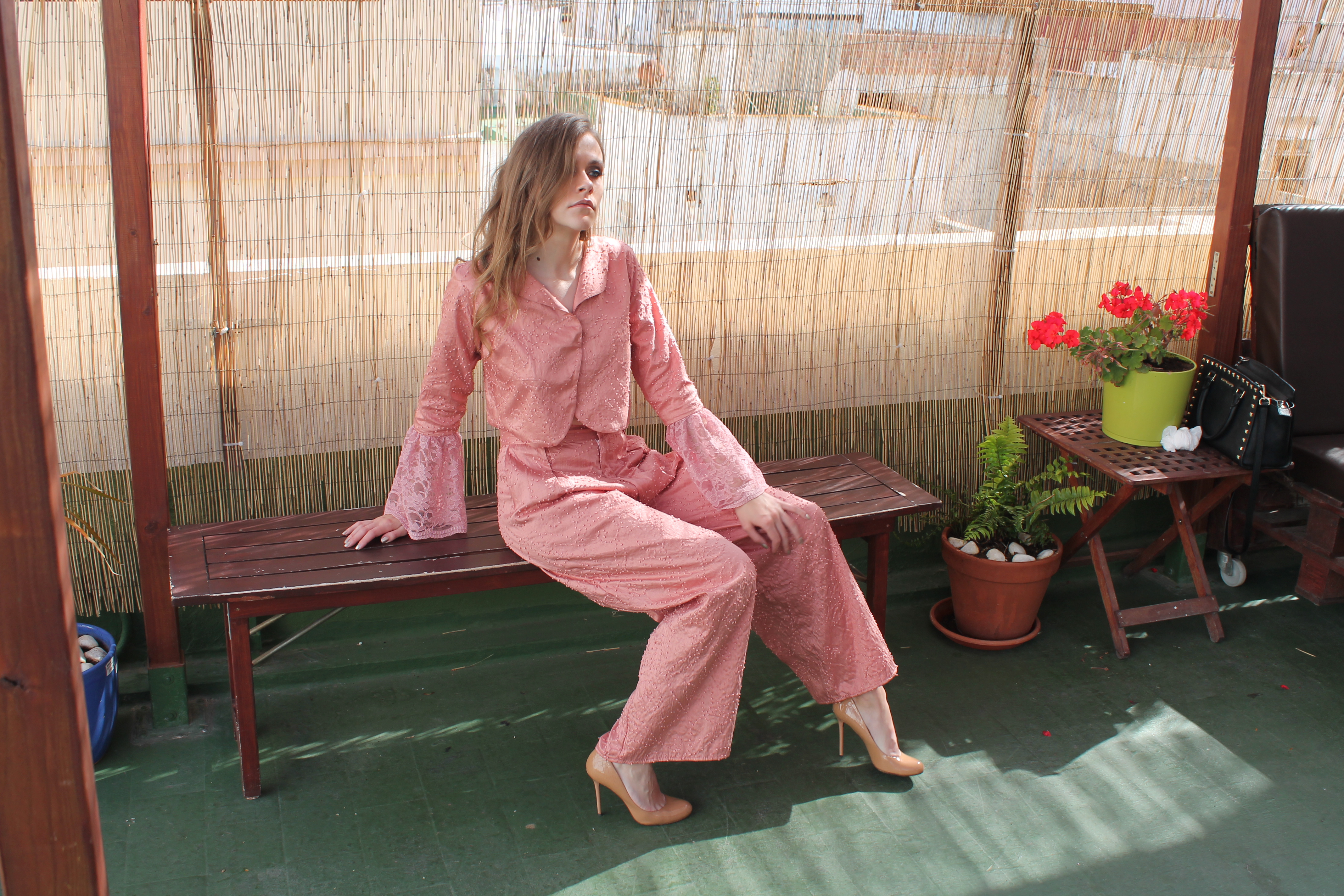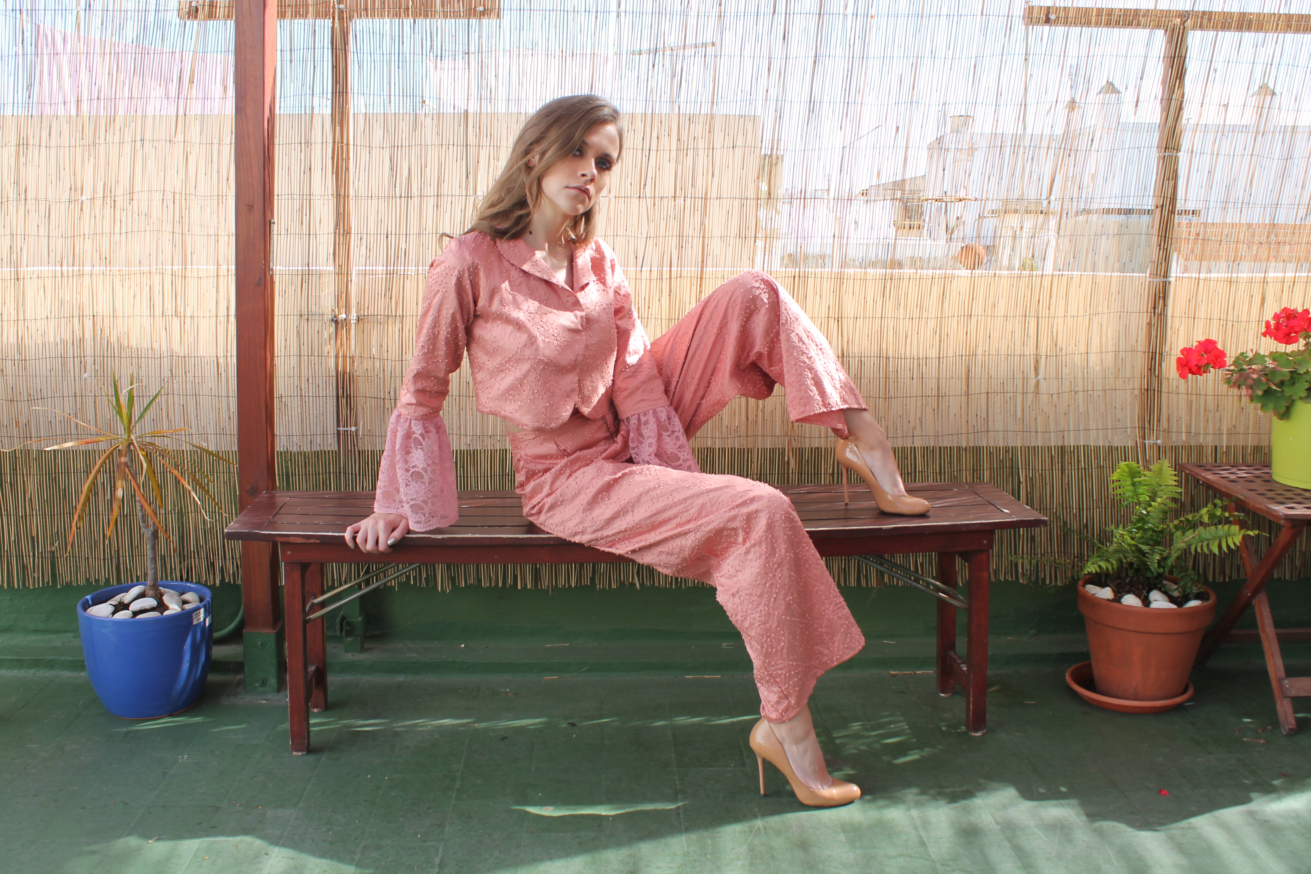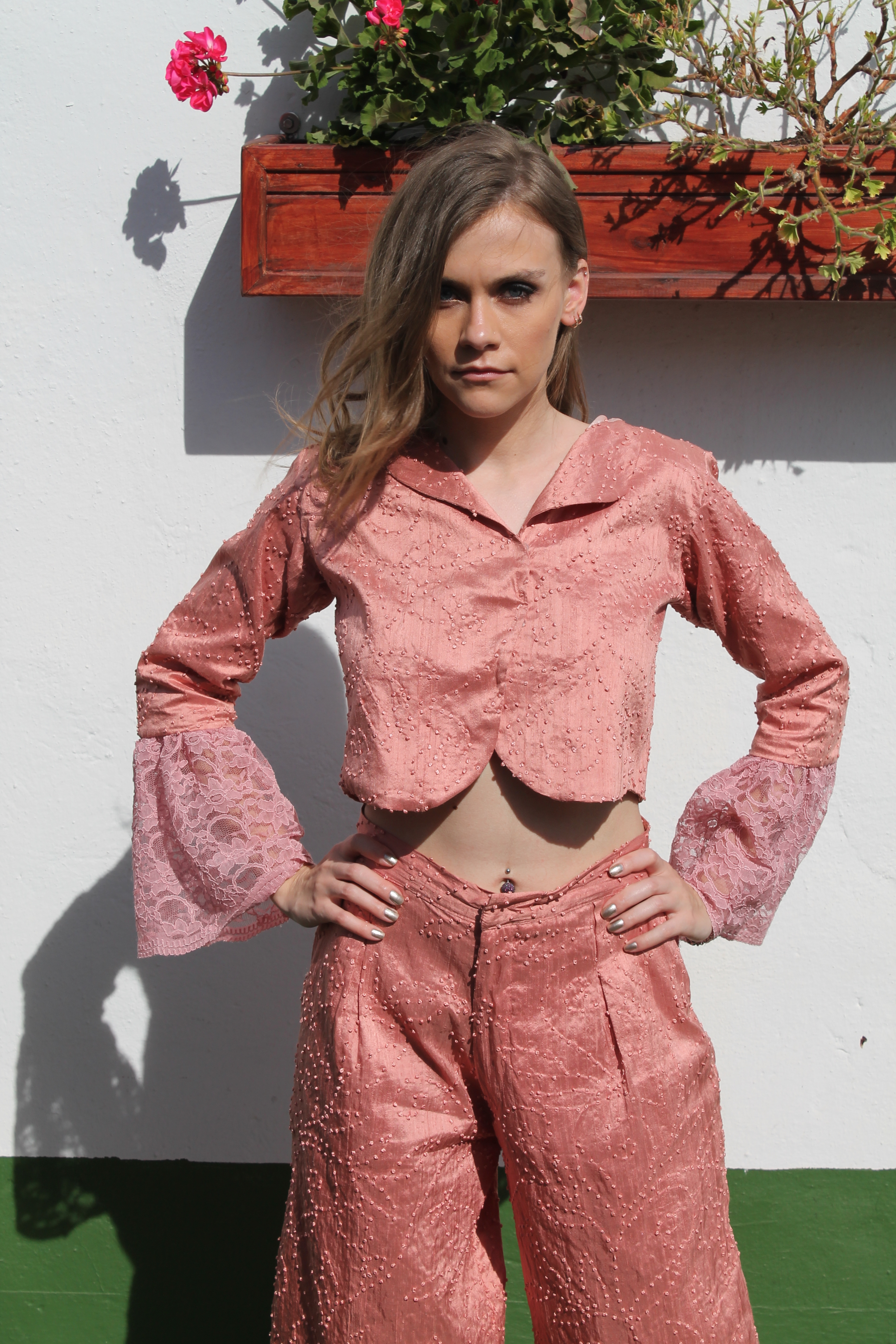 Rosa salvaje Wild rose. Pantalon estilo palazzo en seda salvaje, rosa palo. Torera en seda salvaje, rosa palo y mangas combinadas con encaje rosa de guipur. Palazzo style trousers in wild silk, pale pink. Wild silk, pale pink top and sleeves combined with pink guipure lace.